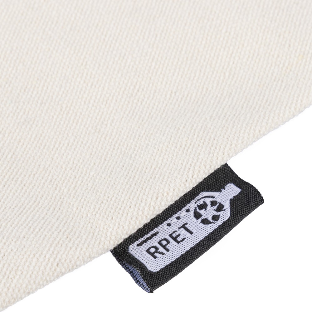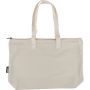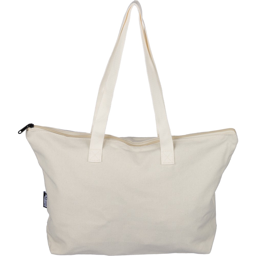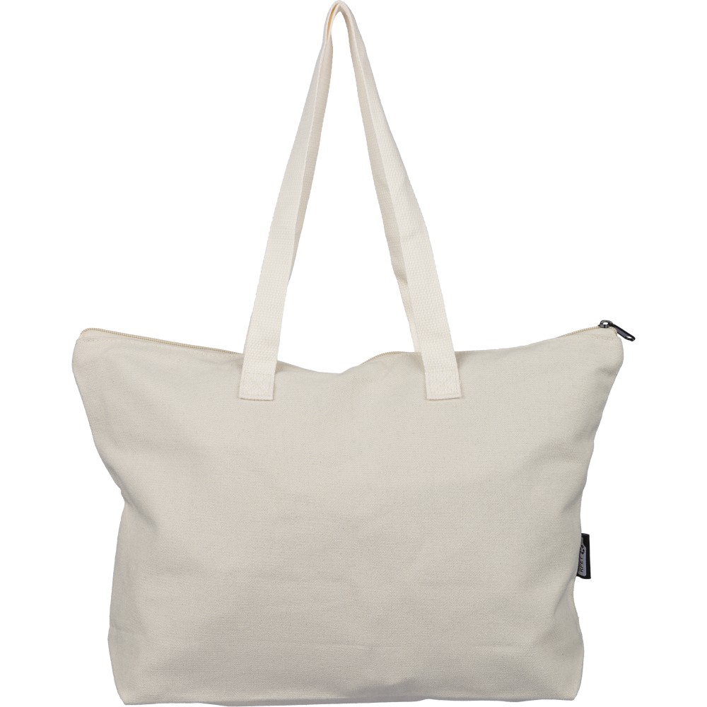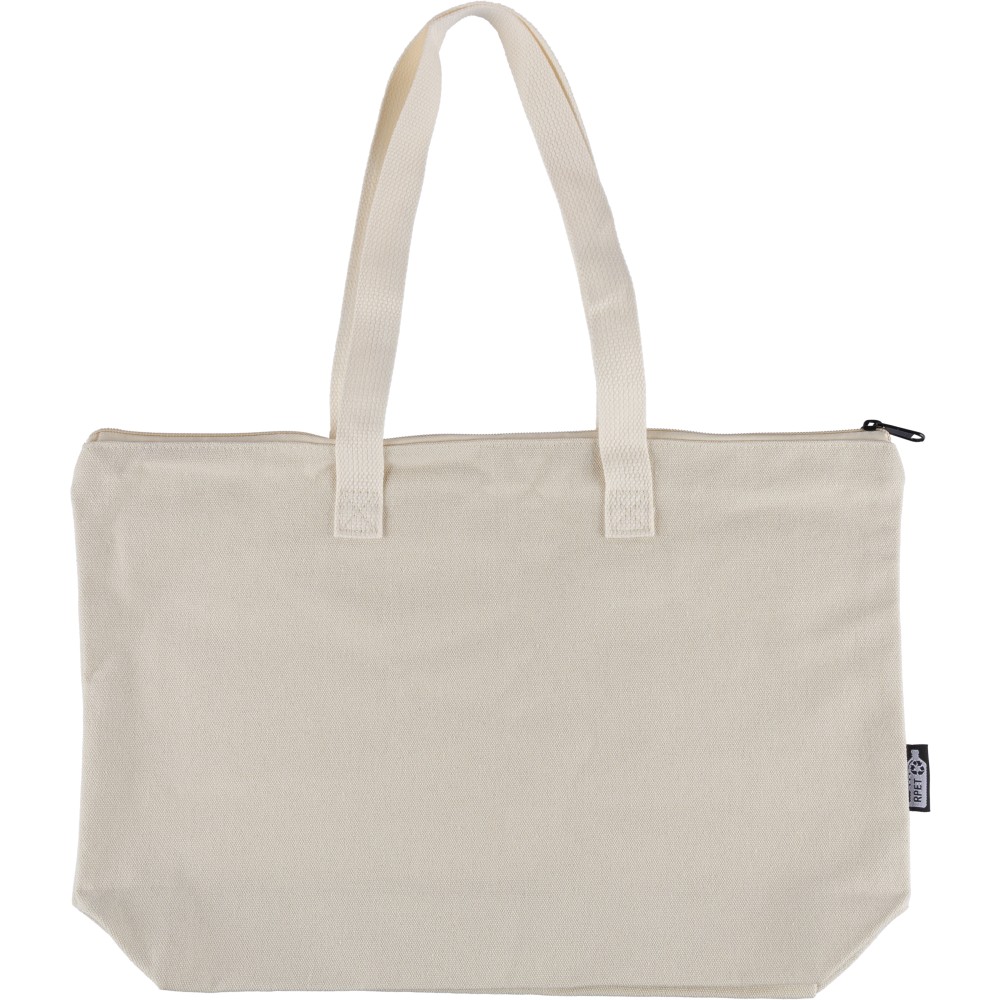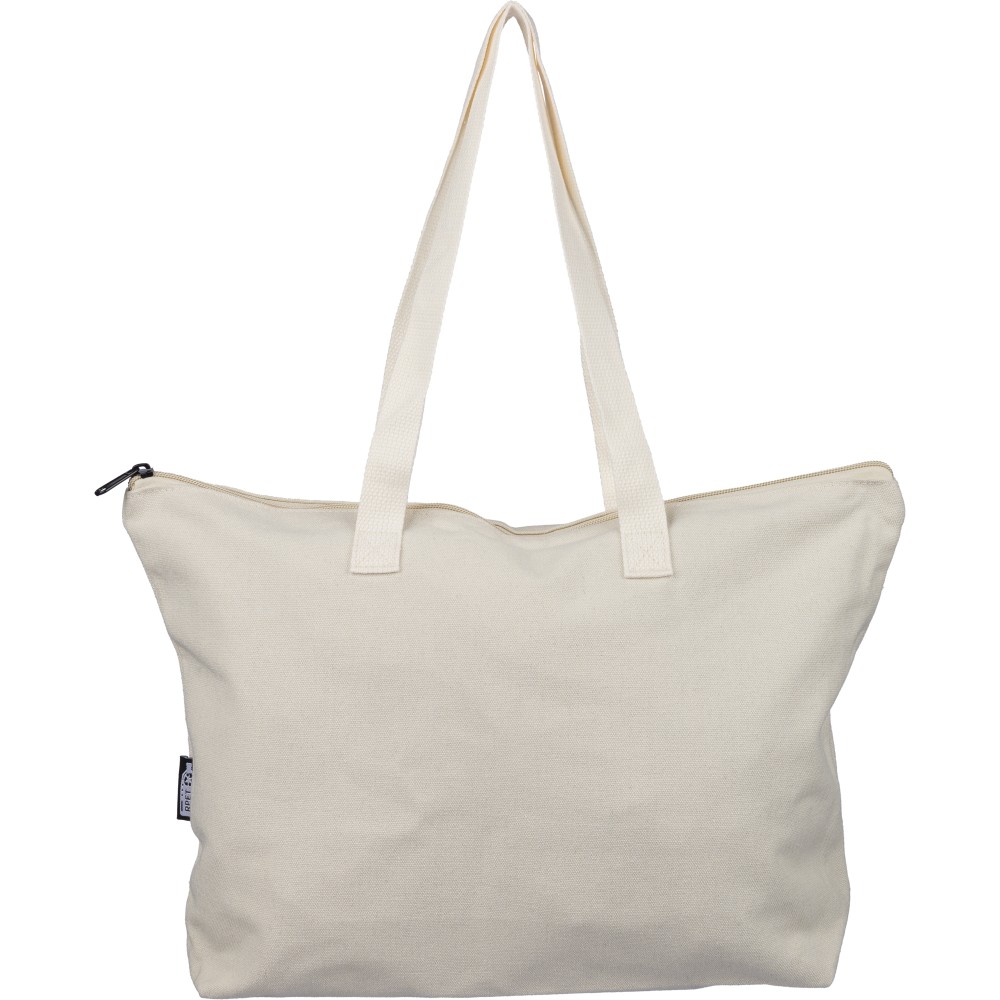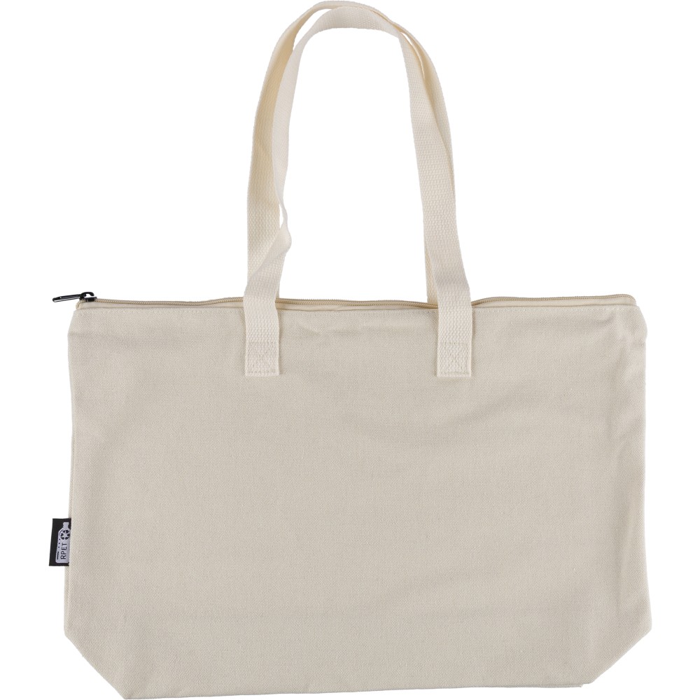 Újrahasznosított pamut-poliészter, 330 g/m2 kevertszövetből készült bevásárlótáska nagy, cipzáras felső rekesszel, 65 cm hosszúságú és 2,5 cm szélességű hosszú fülekkel, a táska színével harmonizáló hevederrel. Külső felületén rPET címkével, belső részén további címkével ellátva. Emblémázás: Szitanyomás