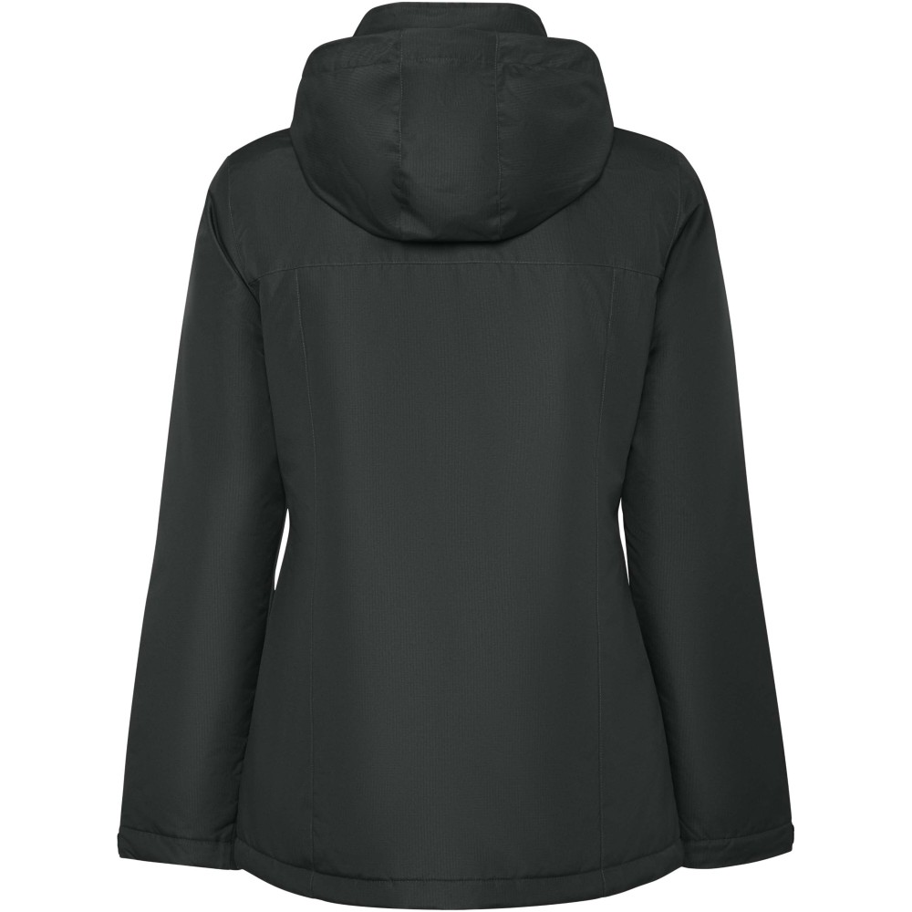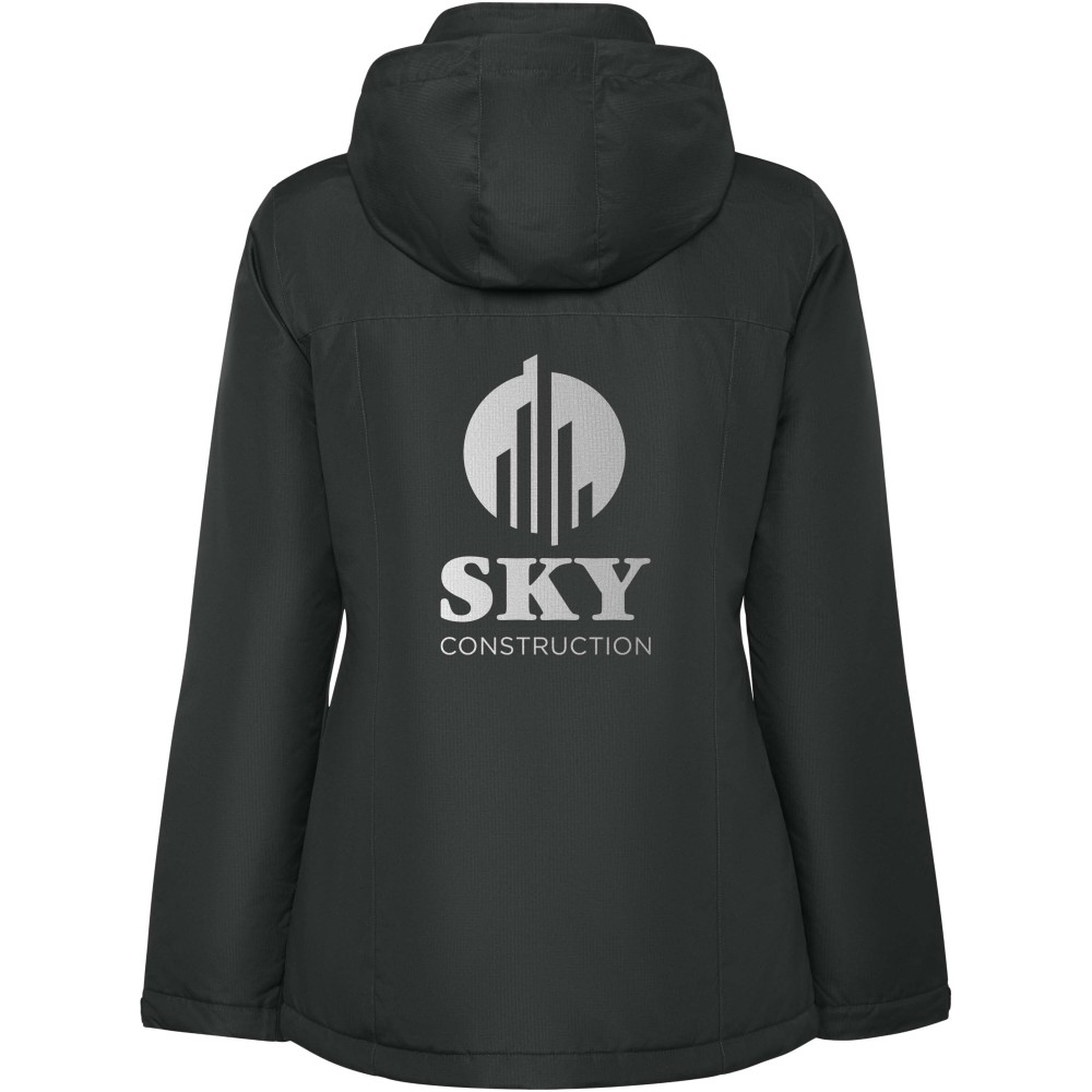 Vízálló bélelt parka nőknek. Karcsúsított fazon. Magas gallérral és levehető kapucnival, tépőzáras záródással. Oldalsó zsebek cipzárral, belső zseb tépőzáras záródással. Állítható mandzsetták tépőzáras övhurkokkal. Belső hozzáférés a hátsó és a bal mellkasi megerősítésekhez. Emblémázás: Hímzés