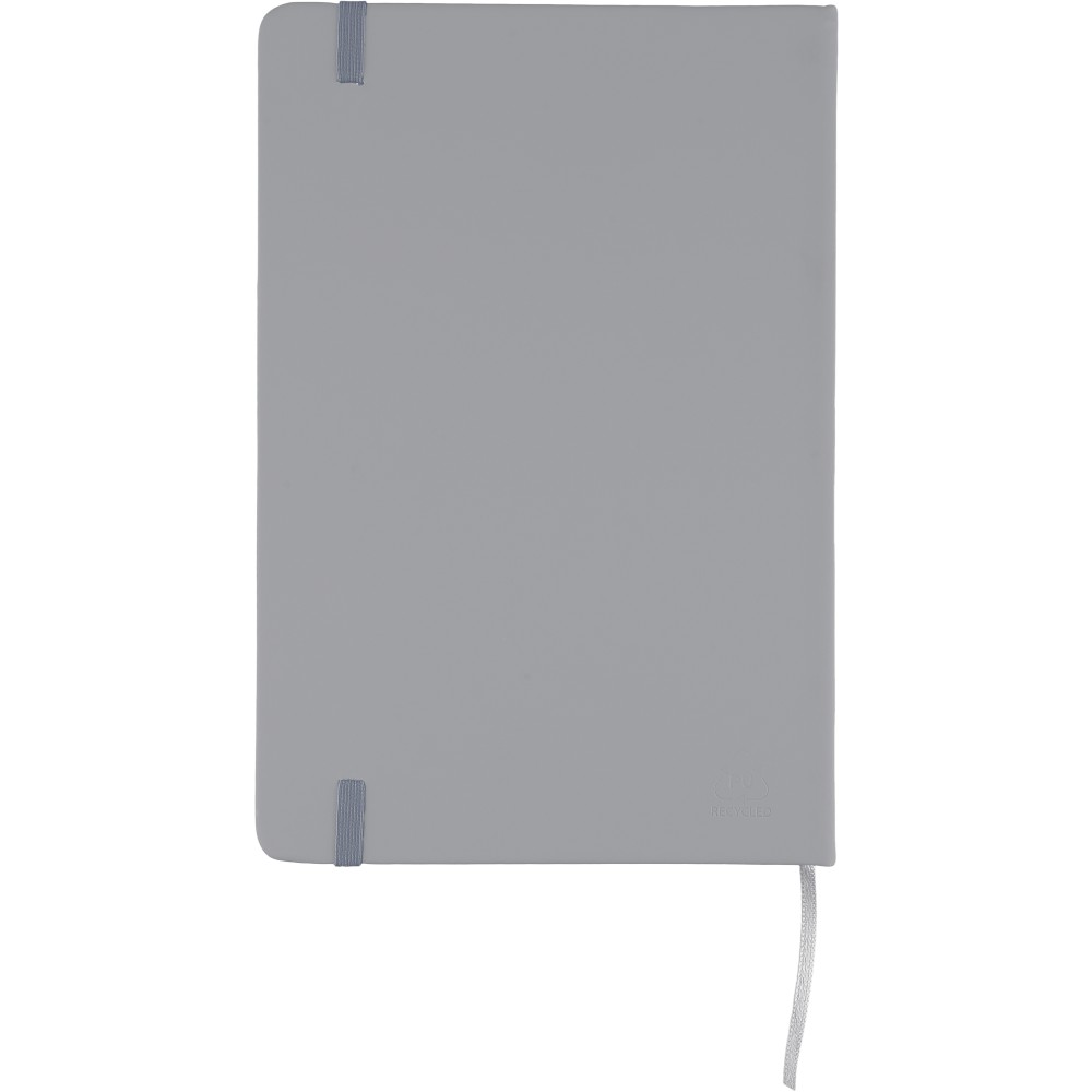 A5-ös méretű jegyzetfüzet rPET PU anyagból készült kemény borítóval, 80 vonalas lappal (70g/m2), színben illeszkedő gumipánttal és könyvjelző szalaggal. Az újrahasznosított anyagra utaló dombornyomott logóval a füzet hátoldalán.