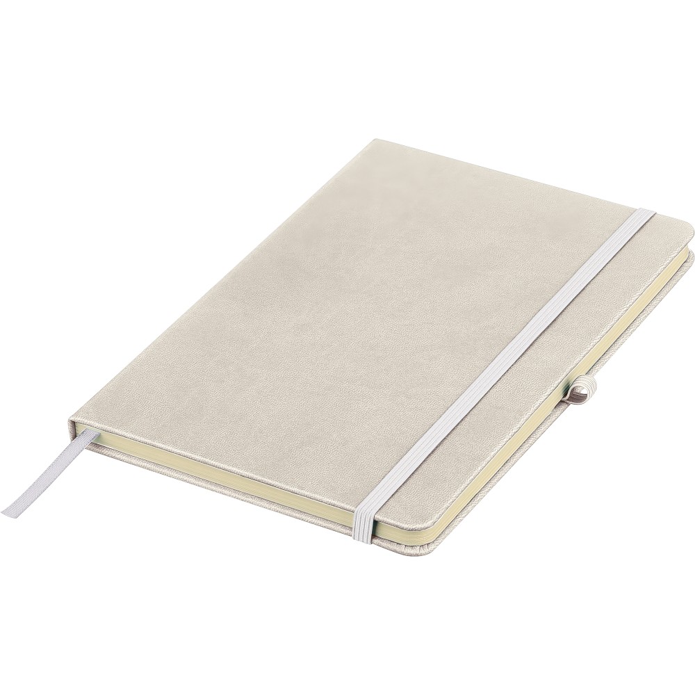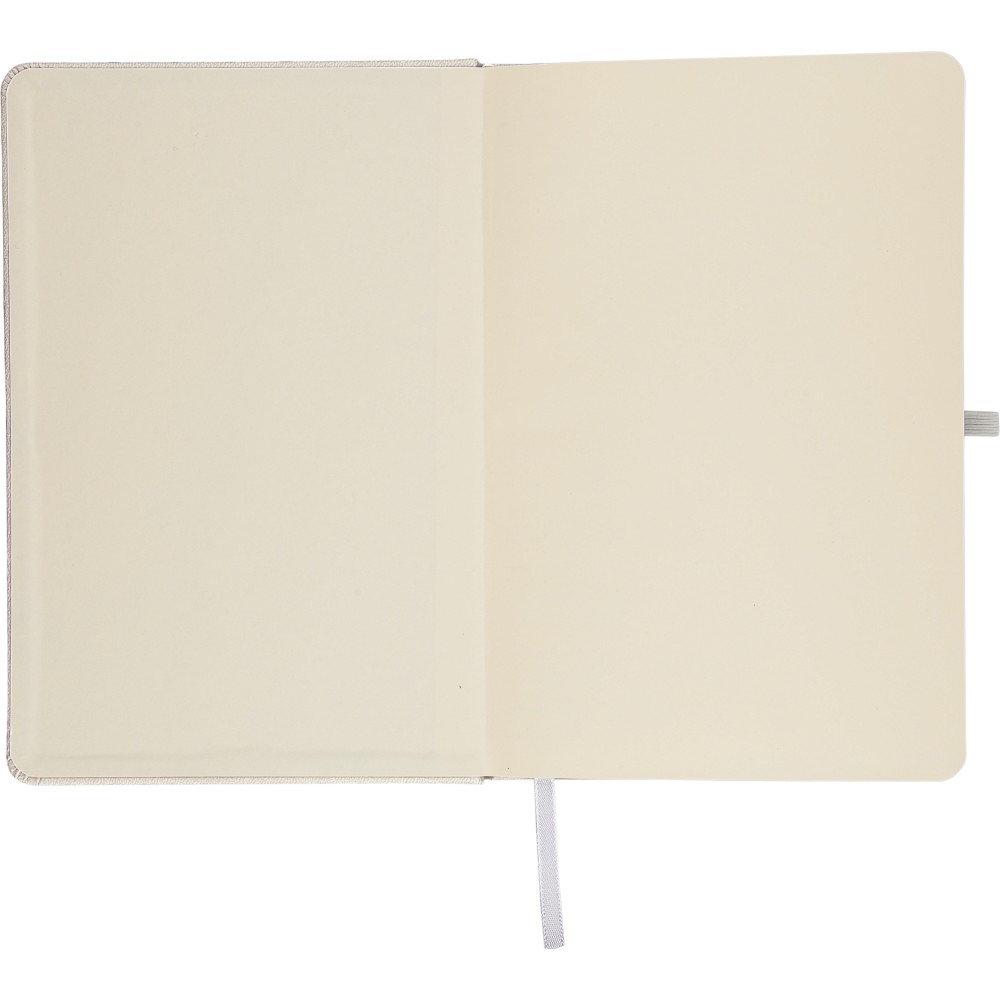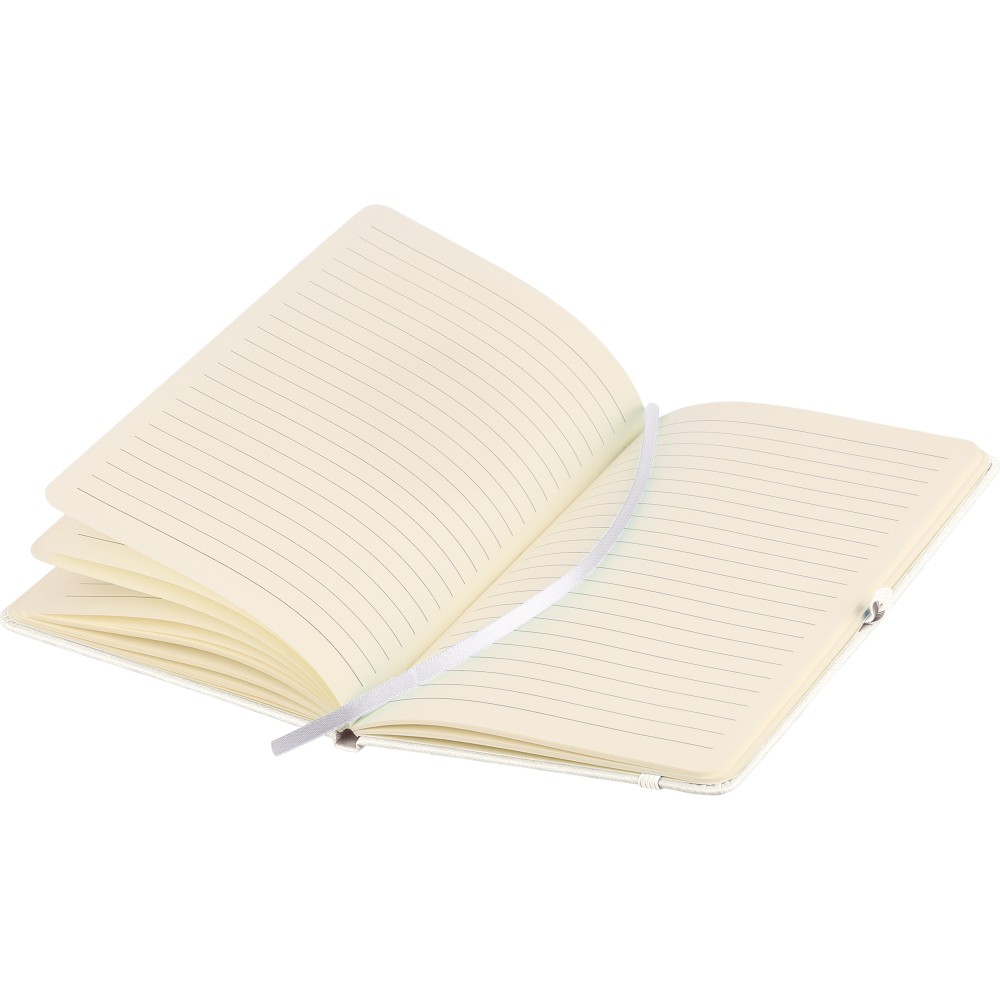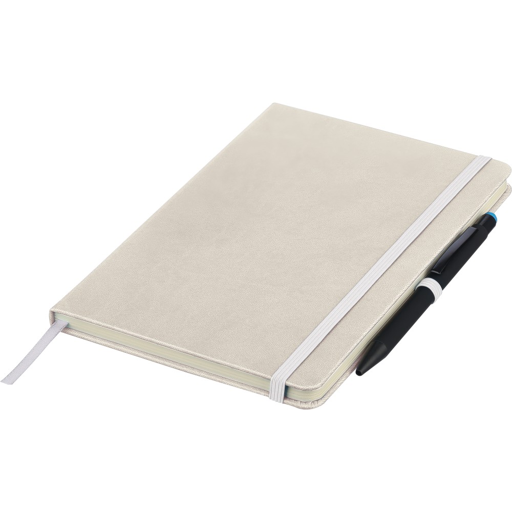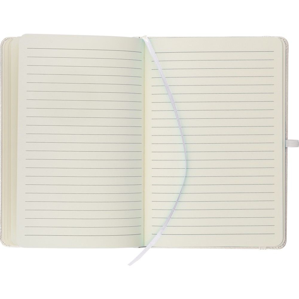 A5-ös jegyzetfüzet újrahasznosított kemény PU borítóval, a hátoldalán dombornyomott újrahasznosított logóval. Tartós és rugalmas anyagból készült, amely kényelmes fogást, párnázottságot és hosszan tartó használatot biztosít. A borító lézergravírozásra alkalmas, amely során finom, tone-on-tone (színazonos) hatás érhető el. 80 vonalas, 70 g/m2 súlyú lapot tartalmaz, színben illeszkedő gumírozott rögzítőpánttal, könyvjelző szalaggal és tolltartó hurokkal. A füzetben használt papír FSC Mix tanúsítvánnyal rendelkezik.