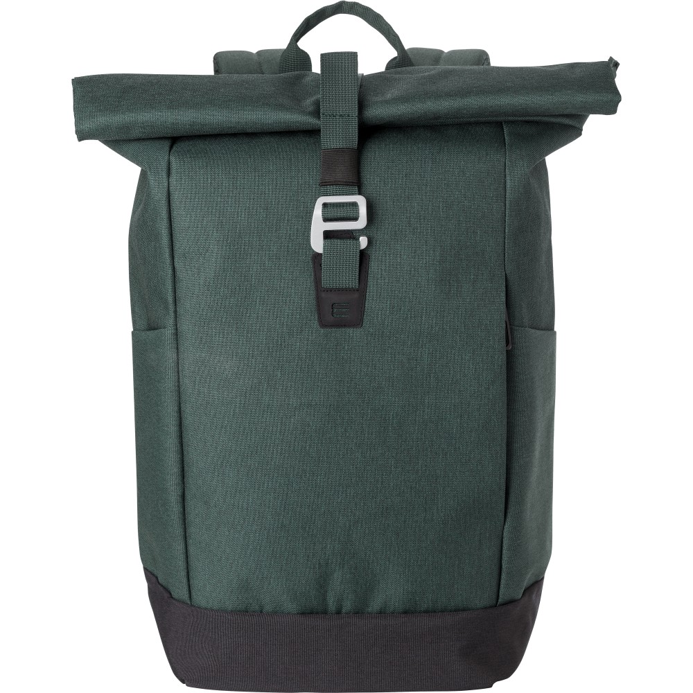 Poliészter (600D) rolltop hátizsák. Egy nagy cipzáras rekesz két csúszózsebbel és egy laptop rekesszel. Cipzáras rekesz elöl. Párnázott hátoldal és pántok. Fémhorog a záráshoz. Emblémázás: Szitanyomás