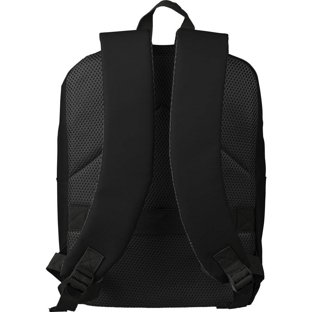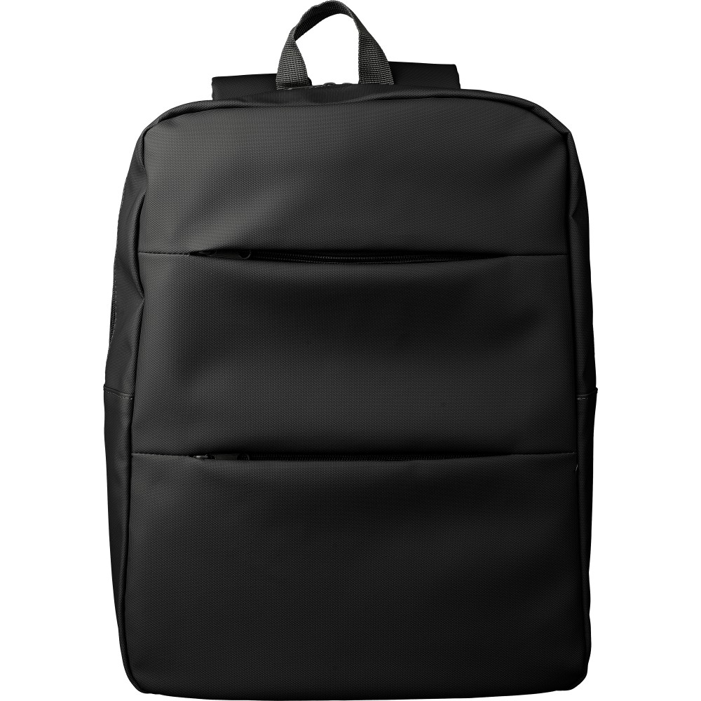 Laptop hátizsák 15 -es készülékhez. Két cipzáras elülső zsebbel, egy nagy cipzáras rekesszel és tépőzáras laptoprésszel, valamint több belső zsebbel. Szellőző, párnázott hátoldallal, trolifogantyúval és állítható vállpántokkal. Vízlepergető. Anyaga: PU. Emblémázás: Szitanyomás