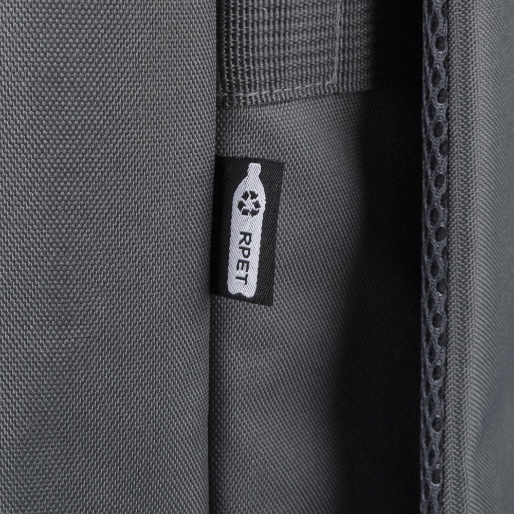Újrahasznosított 900D poliészterből készült hátizsák, 210D béléssel és rPET címkével. Tágas fő rekesszel rendelkezik, 16?-os laptop számára kialakított külön zsebbel, elülső rekesszel, két oldalzsebbel, valamint bőröndre rögzíthető pánttal (trolley strap). Felső fogantyúi gombbal összefoghatóak, vállpántjai szellőző kialakításúak a kényelmes viselet érdekében.