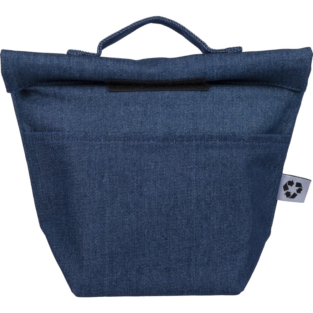 Újrahasznosított farmeranyagból készült, 27 × 10 × 31 cm méretű roll-top kialakítású hűtőtáska tépőzáras záródással, PEVA belső réteggel és rövid fogantyúval. Elülső zsebbel és a külső felületen elhelyezett újrahasznosított alapanyagra utaló címkével ellátva. Emblémázás: Szitanyomás