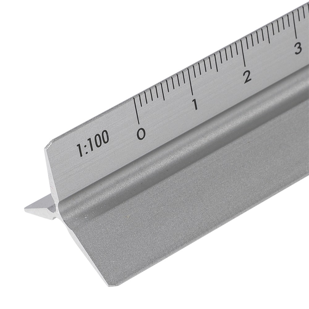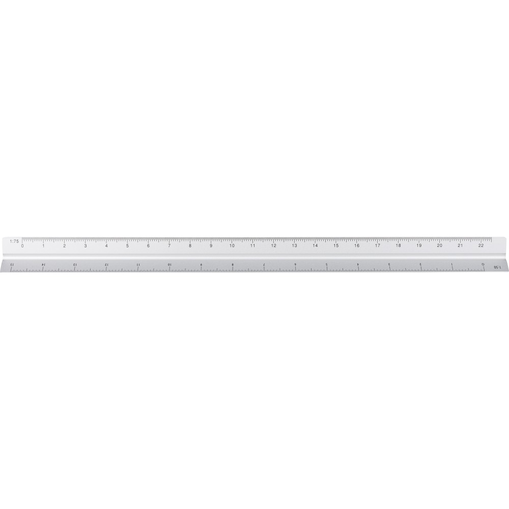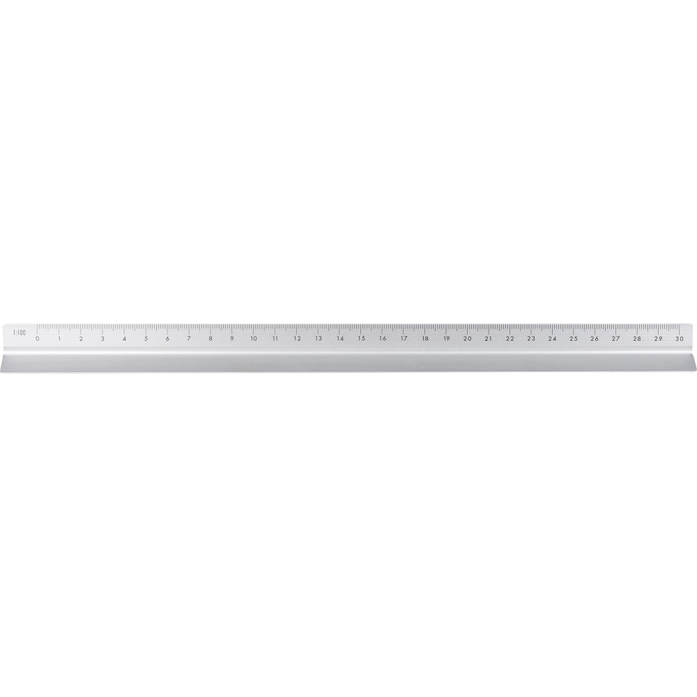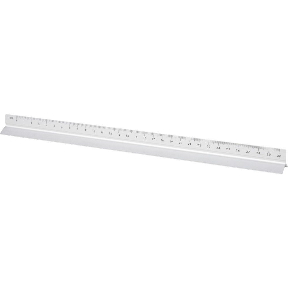 Alumíniumból készült, 30 cm hosszú háromszög alakú vonalzó több mérési léptékkel: 1:20, 1:25, 1:50, 1:75 és 1:100. Az egyik oldala skála nélküli gravírozási felületként használható. Centiméter és inch beosztással ellátva. Darabonként barna kartondobozba csomagolva. Emblémázás: Gravírozás