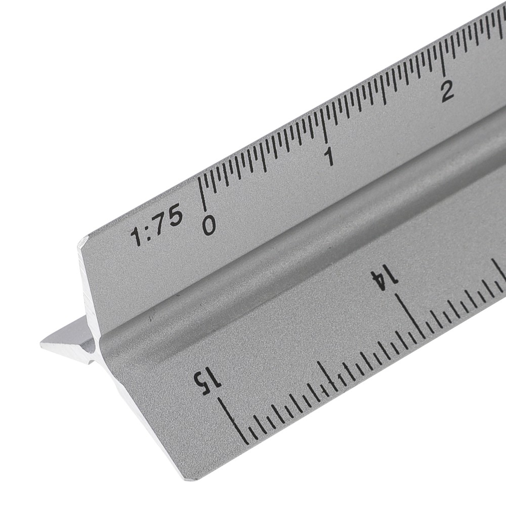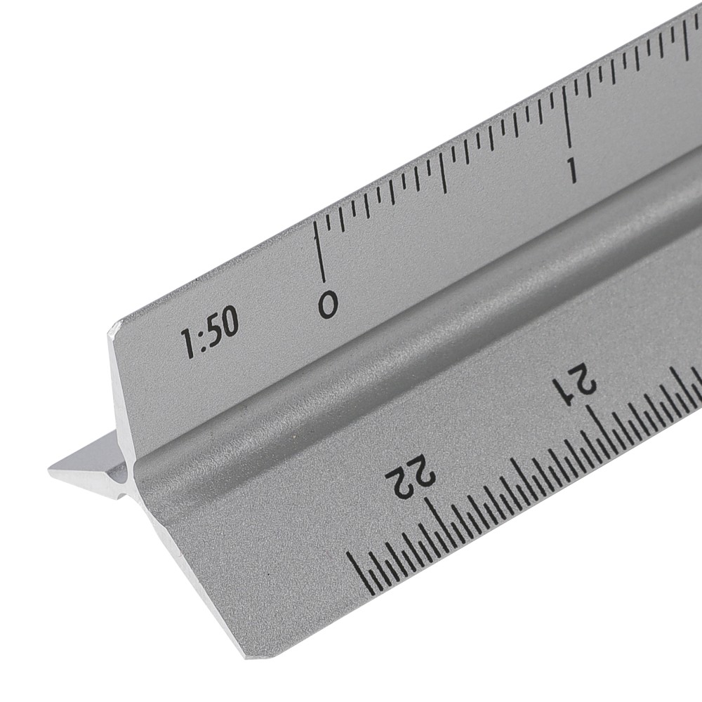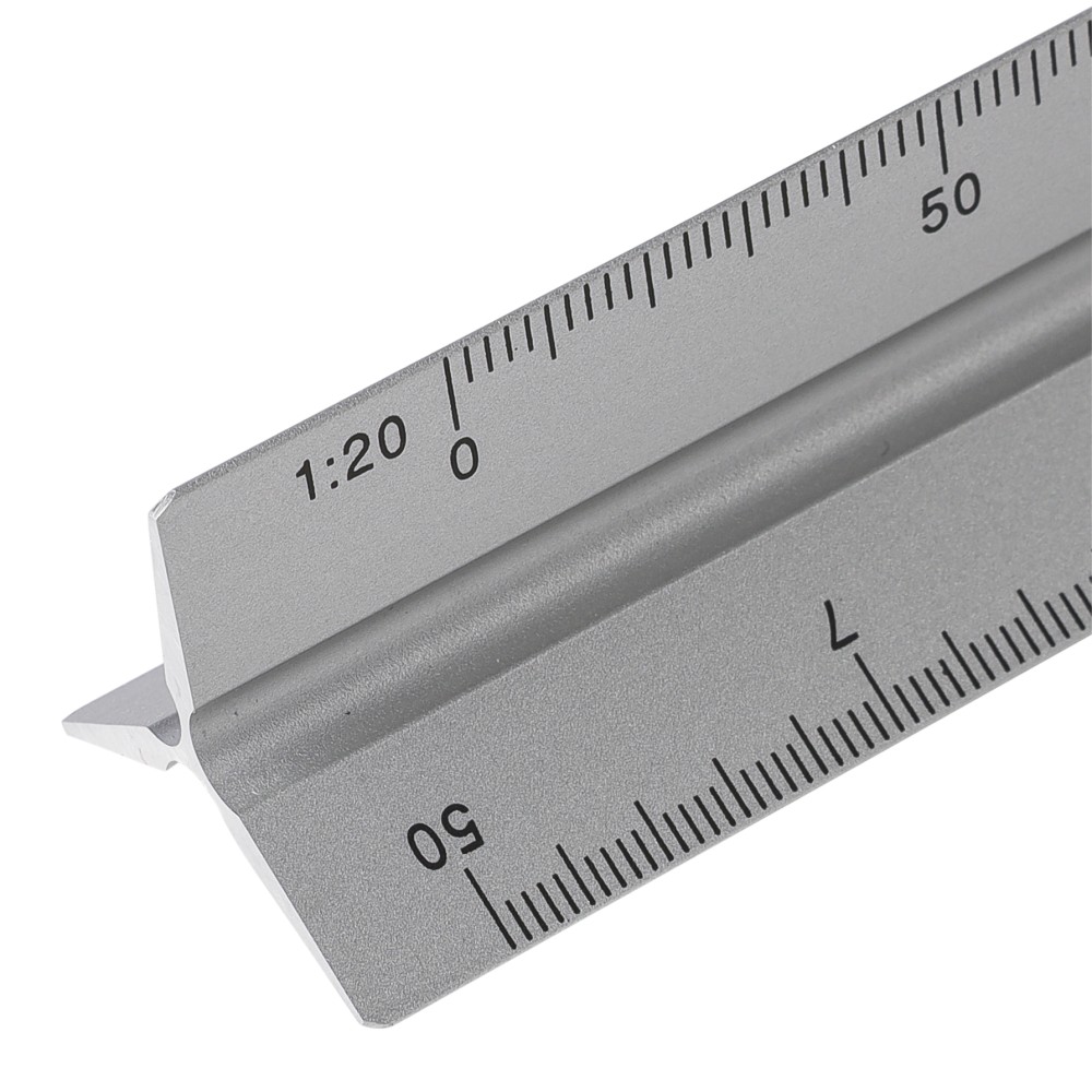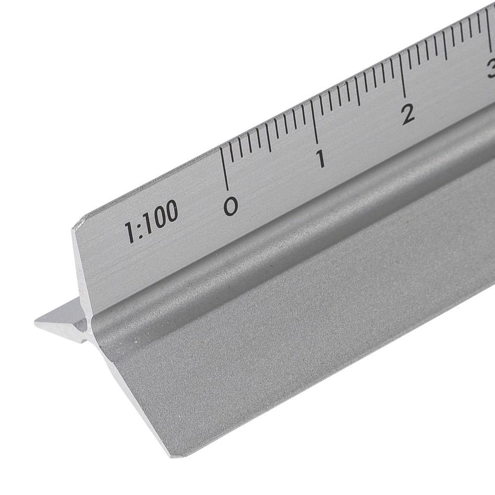 Alumíniumból készült, 30 cm hosszú háromszög alakú vonalzó több mérési léptékkel: 1:20, 1:25, 1:50, 1:75 és 1:100. Az egyik oldala skála nélküli gravírozási felületként használható. Centiméter és inch beosztással ellátva. Darabonként barna kartondobozba csomagolva. Emblémázás: Gravírozás
