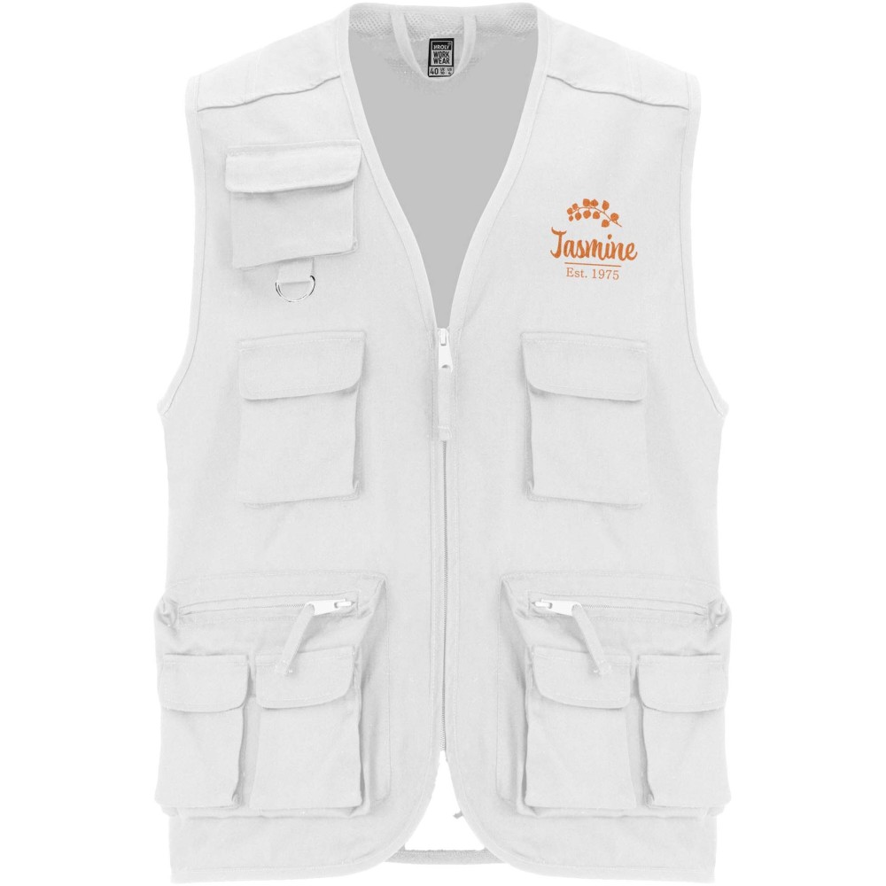 V-nyakú, többfunkciós zsebekkel ellátott munkamellény. Elülső cipzárja húzókával felszerelt. A mellrészen három zseb található, amelyek hajtókával és tépőzárral záródnak, a felső zseb pedig multifunkciós gyűrűvel kiegészített. Két cipzáras és húzókával ellátott oldalsó zsebbel rendelkezik, amelyeken két további, hajtókás és tépőzáras zseb helyezkedik el. A hátoldalon két hajtókás, tépőzáras zseb található. A nyakkivágás, a karkivágások és az derékrész díszítőszegéllyel van ellátva.