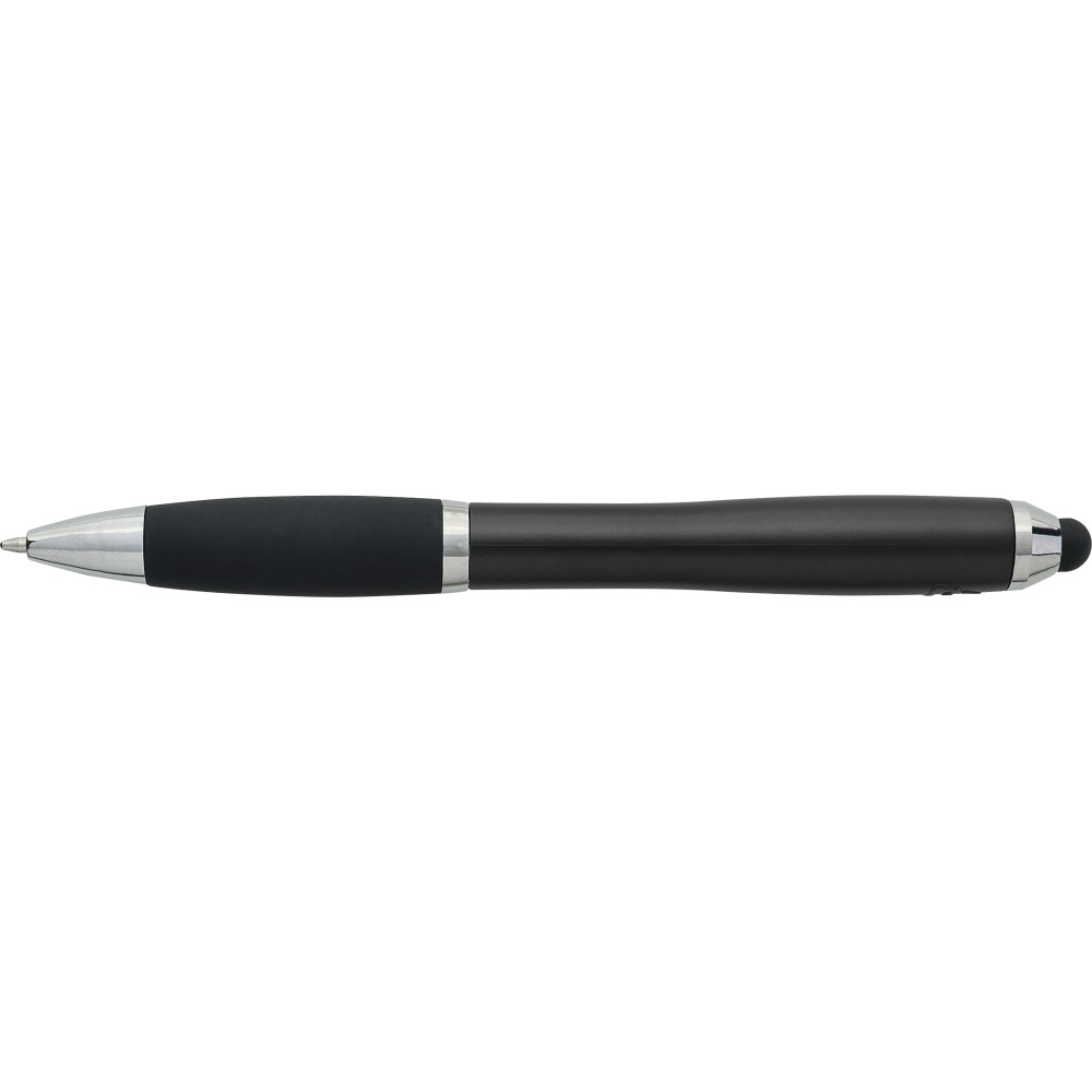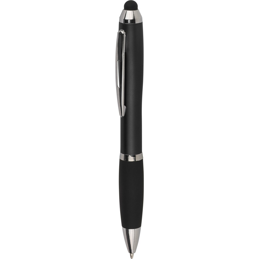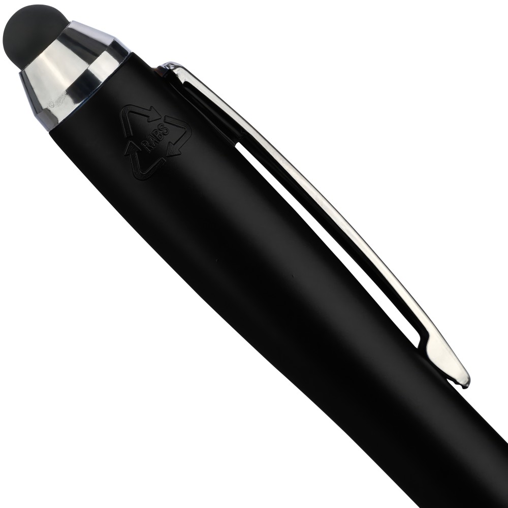 Golyóstoll egyszínű, gumírozott felületű testtel, ezüstszínű kiegészítőkkel és fekete, kapacitív érintőképernyőkhöz használható stylus véggel. Újrahasznosított ABS-ből készült. Nyomógombos szerkezettel, kék tollbetéttel és a tolltesten gravírozott újrahasznosított logóval rendelkezik.