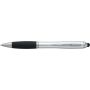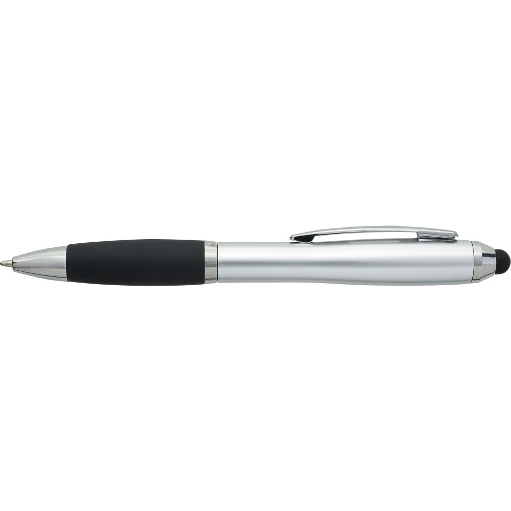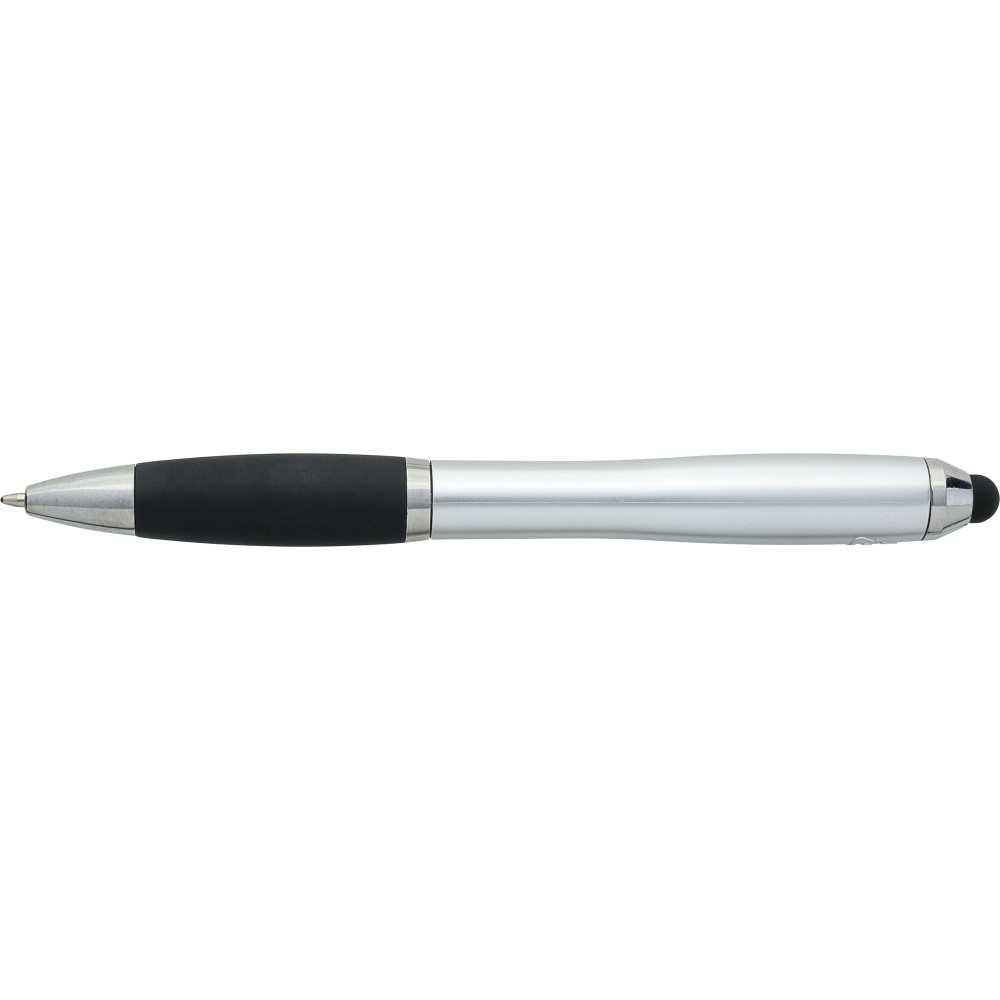 Golyóstoll egyszínű, gumírozott felületű testtel, ezüstszínű kiegészítőkkel és fekete, kapacitív érintőképernyőkhöz használható stylus véggel. Újrahasznosított ABS-ből készült. Nyomógombos szerkezettel, kék tollbetéttel és a tolltesten gravírozott újrahasznosított logóval rendelkezik.
