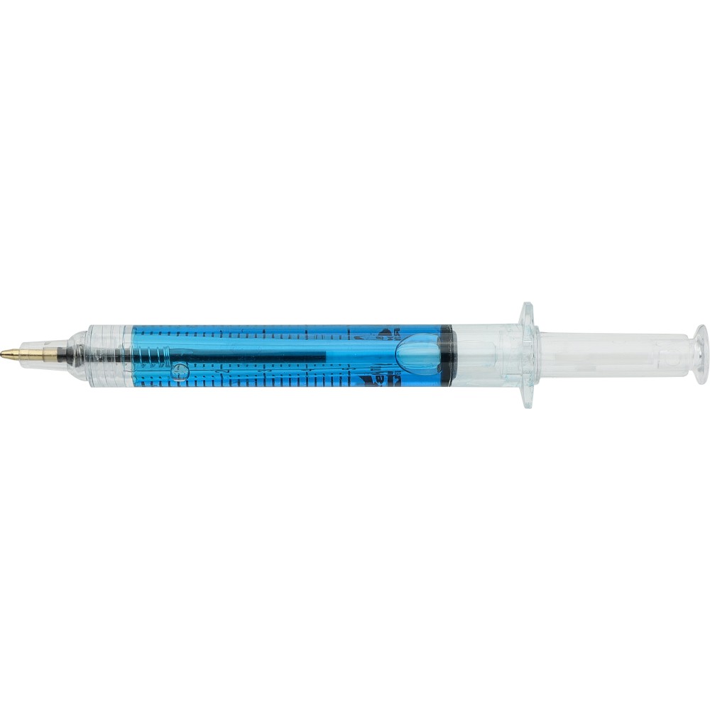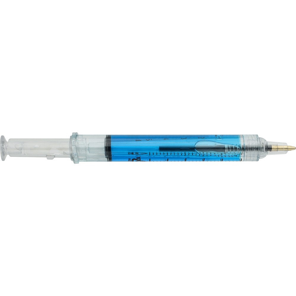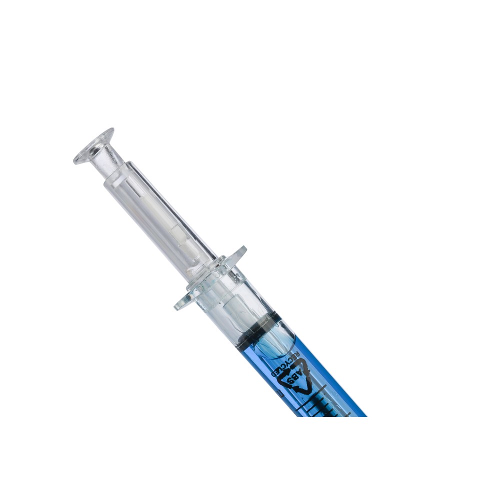 Színes folyadékkal töltött fecskendő alakú golyóstoll. Újrahasznosított ABS-ből készült, nyomógombos szerkezetű, fekete tollbetéttel szállítjuk. Érintőképernyőkhöz használható stylus véggel rendelkezik. In-mould (öntőformában elhelyezett) újrahasznosított ABS logóval díszítve.
