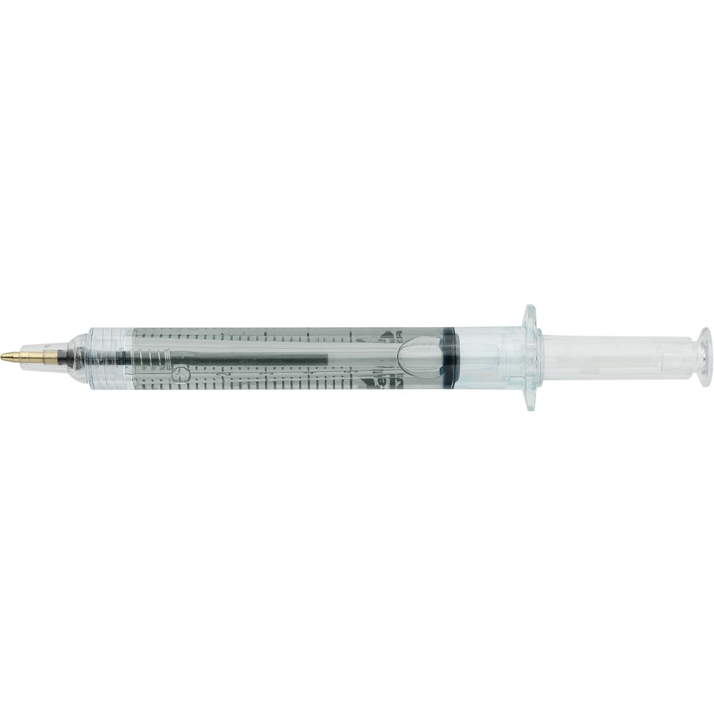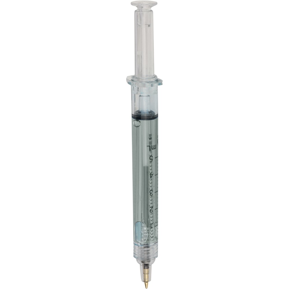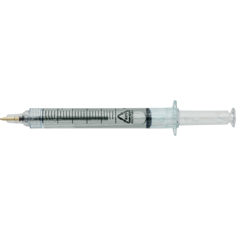 Színes folyadékkal töltött fecskendő alakú golyóstoll. Újrahasznosított ABS-ből készült, nyomógombos szerkezetű, fekete tollbetéttel szállítjuk. Érintőképernyőkhöz használható stylus véggel rendelkezik. In-mould (öntőformában elhelyezett) újrahasznosított ABS logóval díszítve.