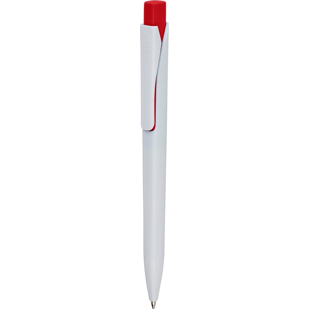 Golyóstoll tömör fehér tolltesttel és színes nyomógombbal. Újrahasznosított ABS-ből készült. Nyomógombos szerkezettel, klipsszel, valamint a nyomógomb tetején újrahasznosított ABS logóval rendelkezik. Kék színű, német Dokumental tollbetéttel, mely körülbelül 800 méter íráshosszt biztosít.