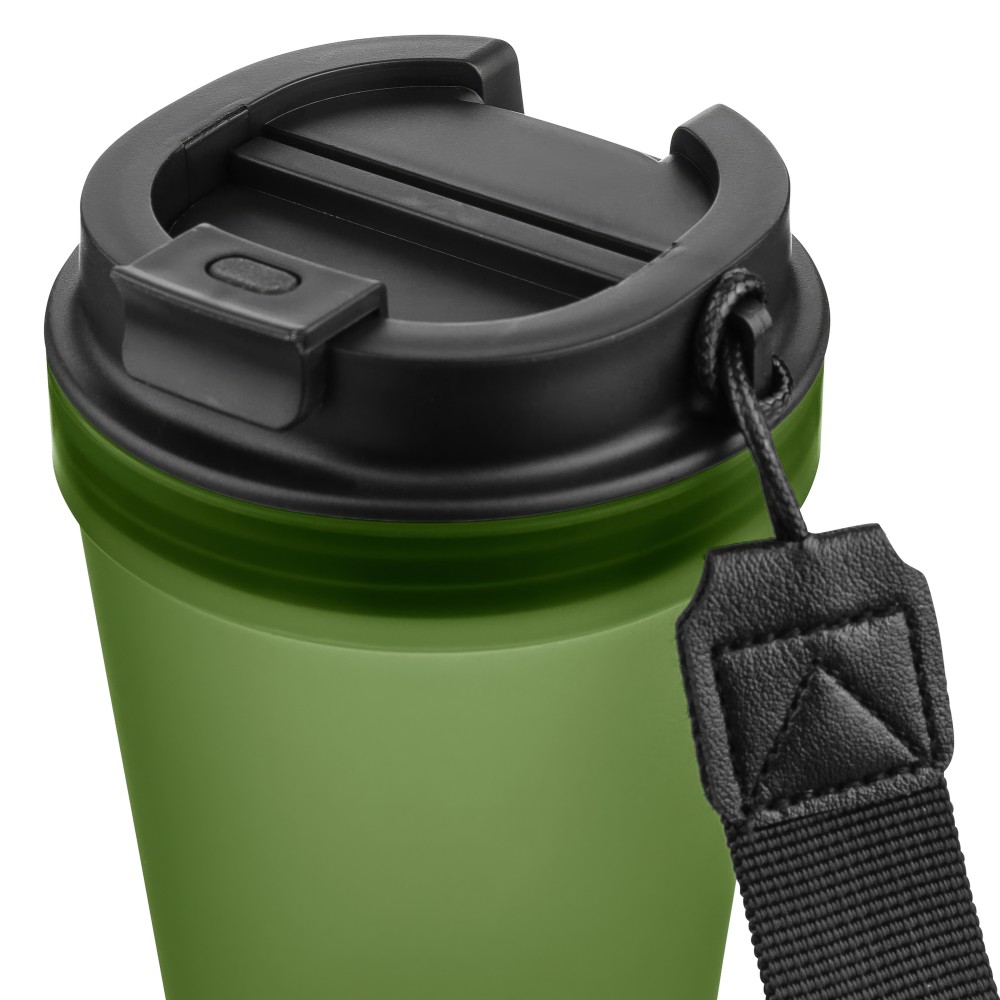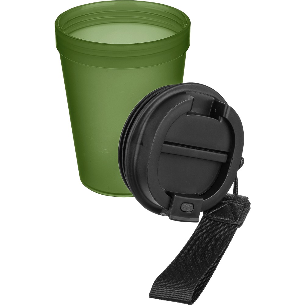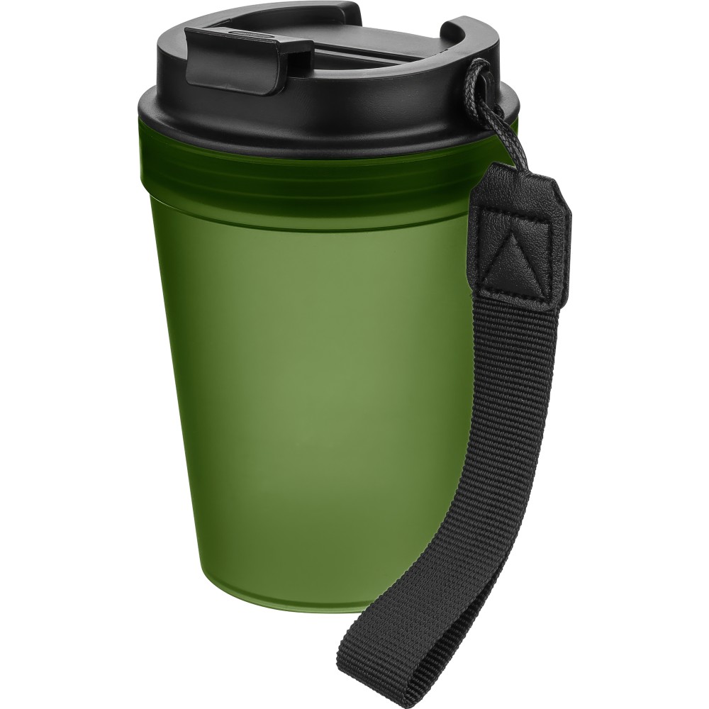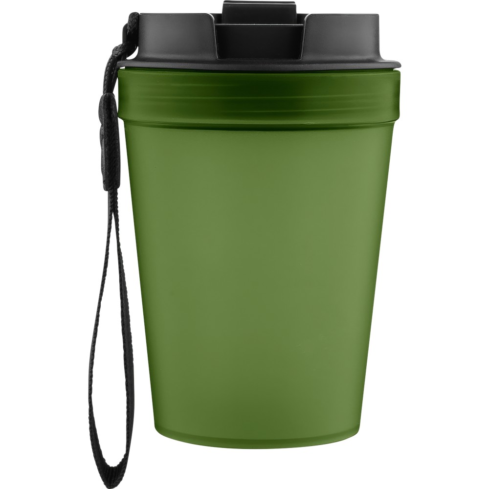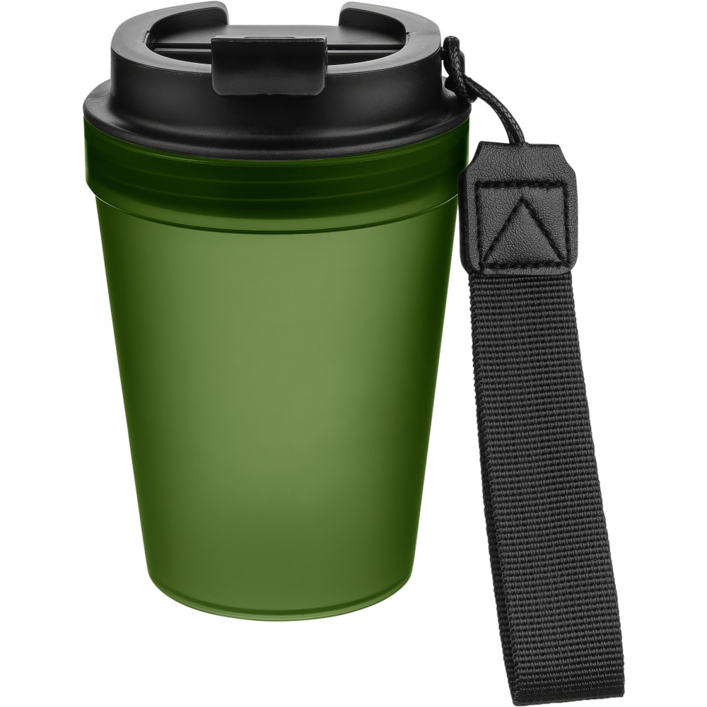 Átlátszó, szimplafalú ivópohár 350 ml-es űrtartalommal, vastagfalú kialakítással. Csavaros fedéllel és poliészter csuklópánttal rendelkezik a könnyű hordozhatóság érdekében. Tartós, ütésálló, megbízható termék. Meleg italokhoz is alkalmas, de kérjük, vegye figyelembe, hogy az egyfalú szerkezet miatt hőátadás előfordulhat.