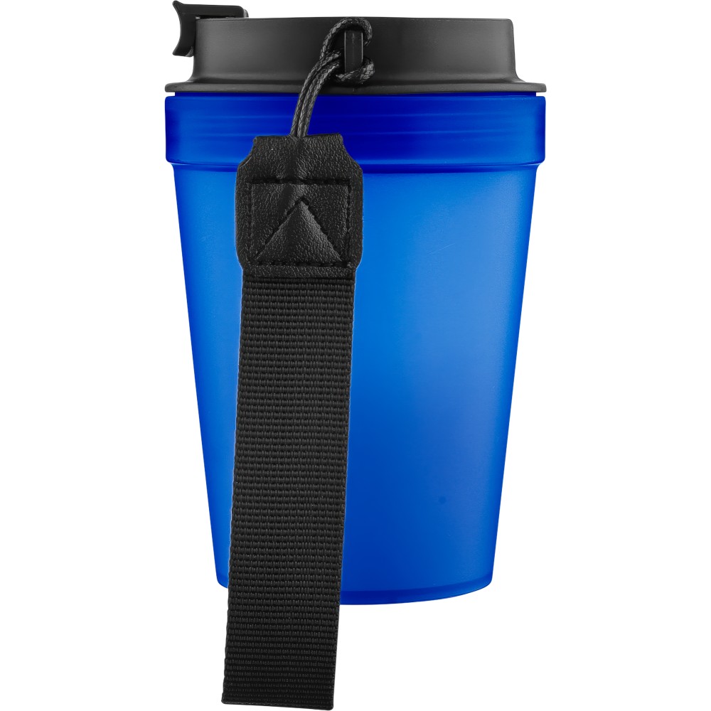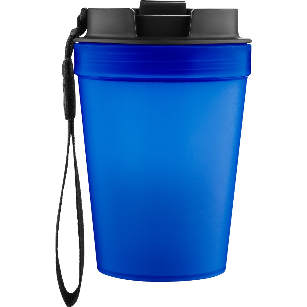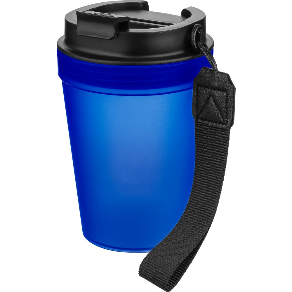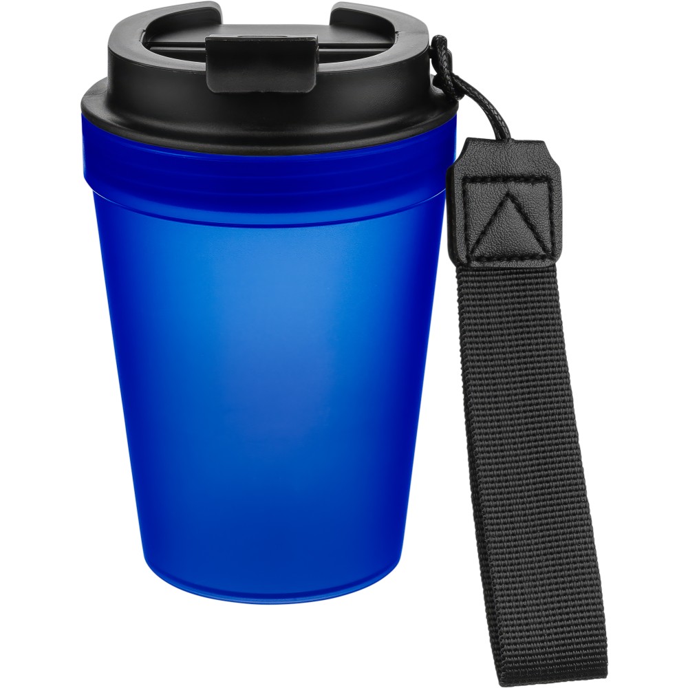 Átlátszó, szimplafalú ivópohár 350 ml-es űrtartalommal, vastagfalú kialakítással. Csavaros fedéllel és poliészter csuklópánttal rendelkezik a könnyű hordozhatóság érdekében. Tartós, ütésálló, megbízható termék. Meleg italokhoz is alkalmas, de kérjük, vegye figyelembe, hogy az egyfalú szerkezet miatt hőátadás előfordulhat.