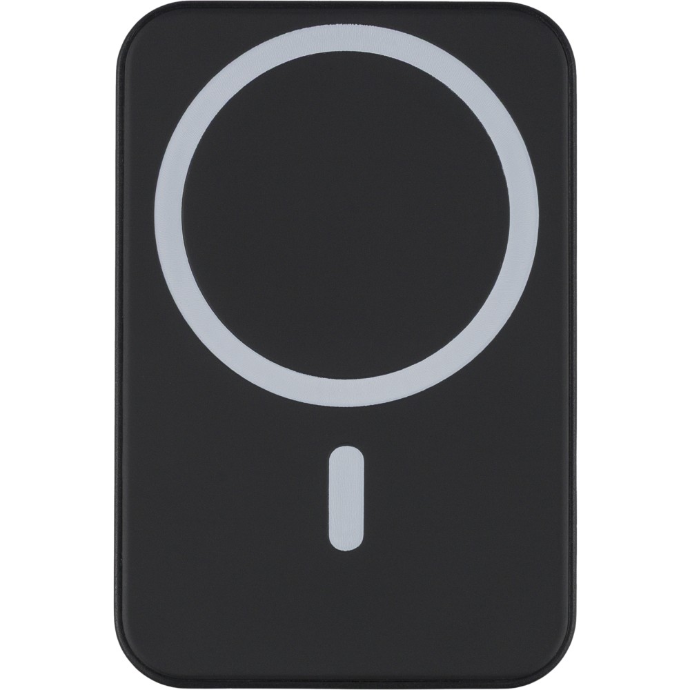 Újrahasznosított ABS anyagból készült vezeték nélküli töltős powerbank 5 000 mAh kapacitással és 15 W MagSafe kompatibilis vezeték nélküli töltéssel. Type-C in/out csatlakozással, beépített biztonsági védelmekkel és automatikus kikapcsolási funkcióval. Nem MagSafe készülékekhez fémgyűrűt tartalmaz. Az oldalán gravírozott recycled (újrahasznosított) alapanyagra utaló logó található. Selyempapírral bélelt barna dobozba csomagolva. Emblémázás: UV nyomtatás