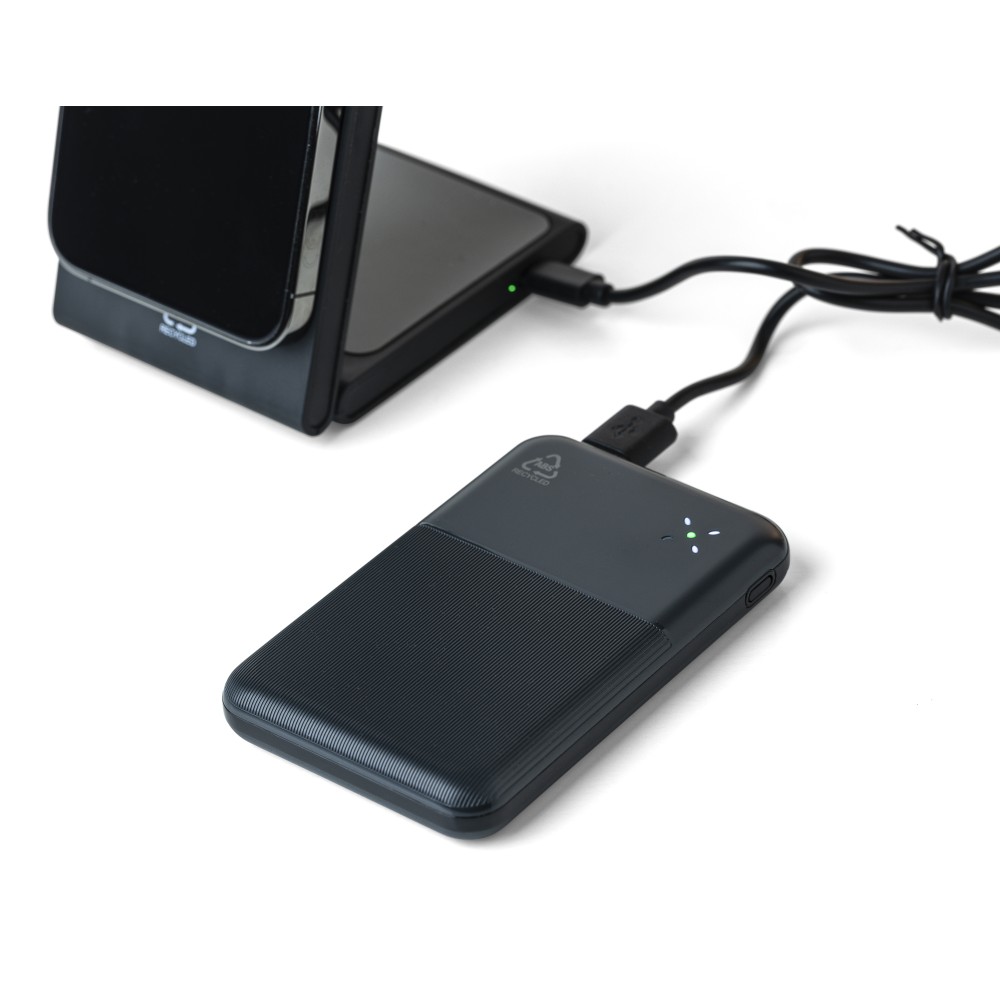 Újrahasznosított ABS anyagból készült powerbank 10 000 mAh kapacitással és 22,5 W gyors töltési teljesítménnyel. Type-C in/out és Type-A bemenettel, digitális kijelzővel, sima és texturált felülettel. Biztonsági védelmekkel ellátva. A hátoldalon gravírozott recycled (újrahasznosított) alapanyagra utaló logó található. Selyempapírral bélelt barna dobozba csomagolva. Emblémázás: UV nyomtatás