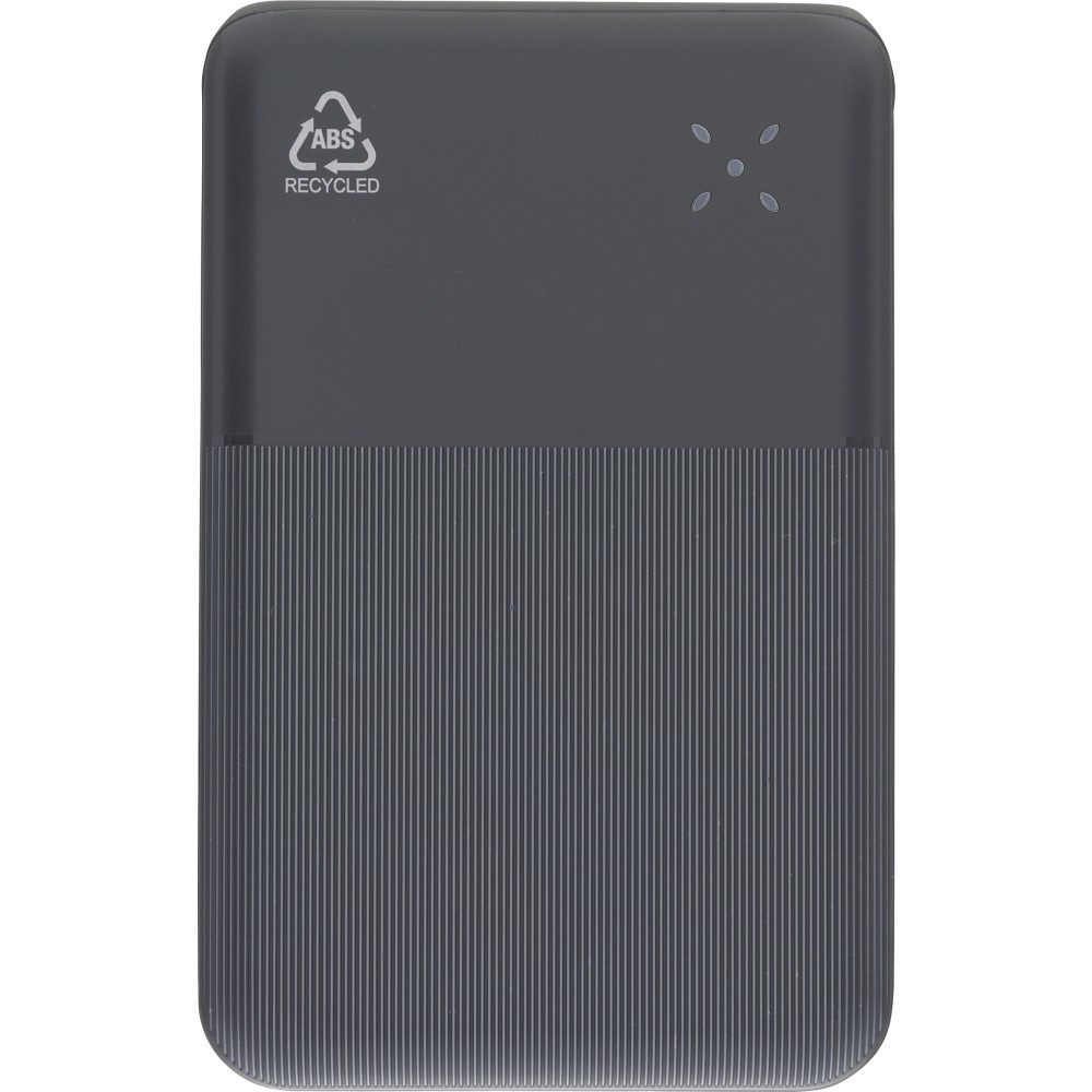Újrahasznosított ABS anyagból készült powerbank 20 000 mAh kapacitással és 22,5 W gyors töltési teljesítménnyel. Type-C in/out és Type-A bemenettel, LED visszajelzővel és biztonsági védelmekkel. A hátoldalon gravírozott recycled (újrahasznosított) alapanyagra utaló logó található. Selyempapírral bélelt barna dobozba csomagolva.