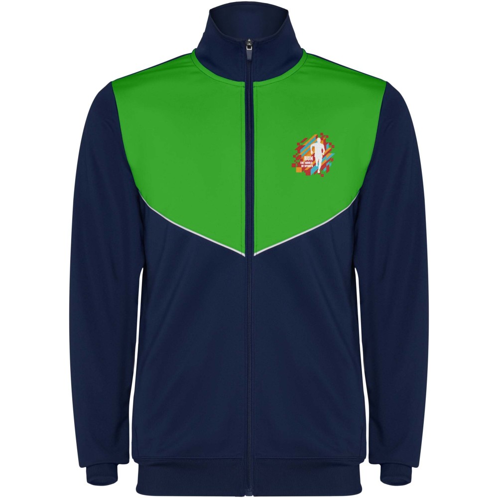 Könnyű és rugalmas anyagból készült melegítő. A végig cipzáros felső kontrasztos színű és varrású díszítésekkel dekorált a mellrészen. Oldalzsebek. Bordázott ujj- és és derékpasszé. Nadrág gumis derékkal és húzózsinórral, kontrasztos oldalsó varrással. Cipzáras szegély. Emblémázás: Hímzés, Szitanyomás