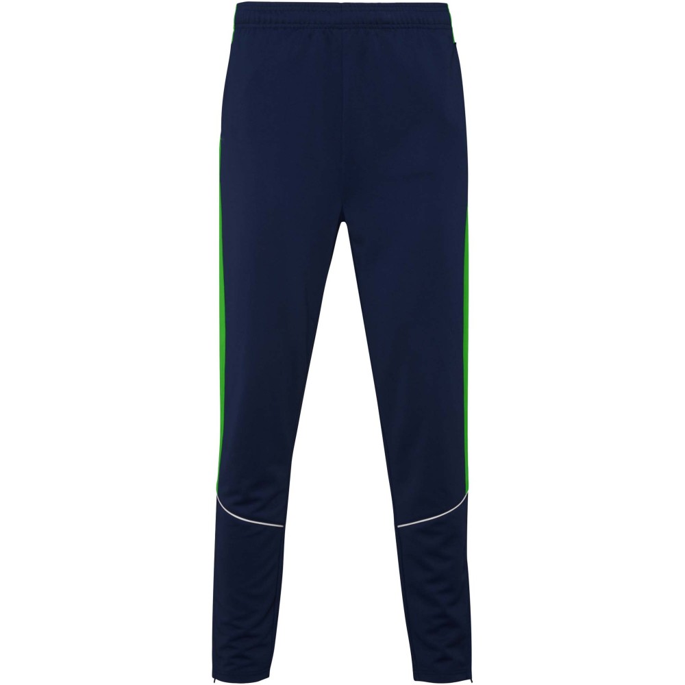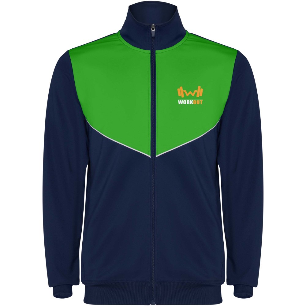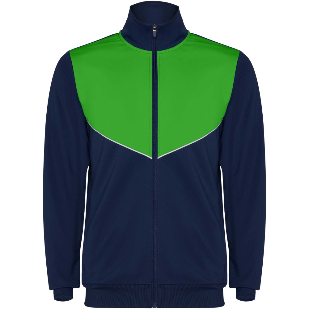 Könnyű és rugalmas anyagból készült melegítő. A végig cipzáros felső kontrasztos színű és varrású díszítésekkel dekorált a mellrészen. Oldalzsebek. Bordázott ujj- és és derékpasszé. Nadrág gumis derékkal és húzózsinórral, kontrasztos oldalsó varrással. Cipzáras szegély. Emblémázás: Hímzés, Szitanyomás