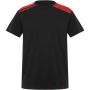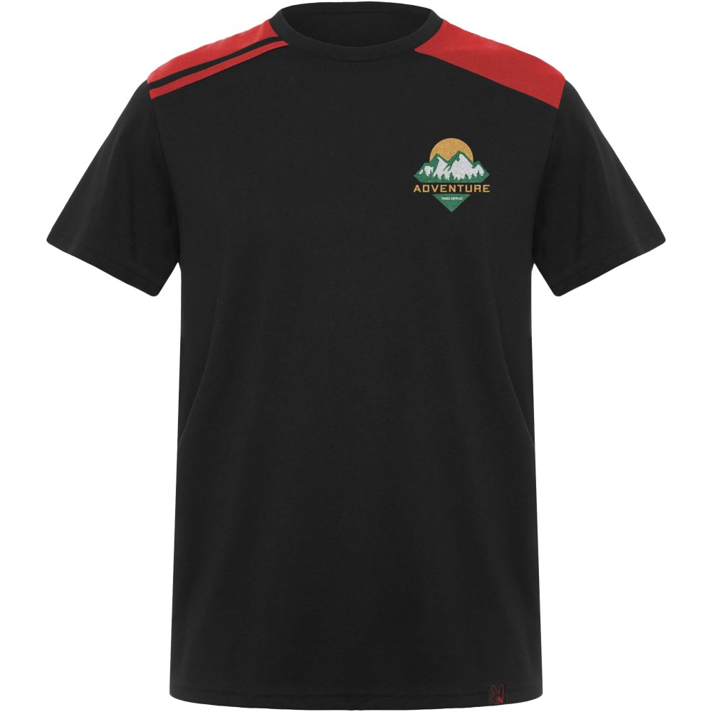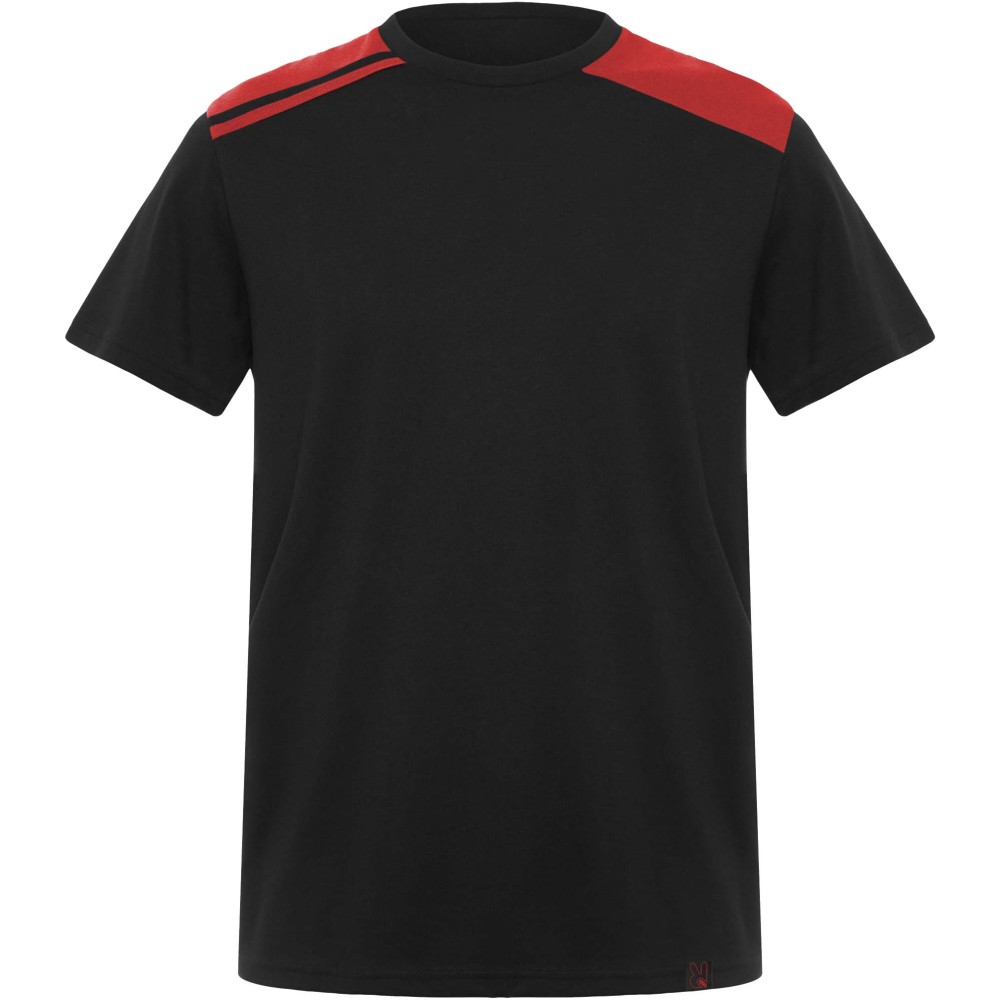 Rövid ujjú, kombinált színvilágú póló, amely kontrasztos vállrészekkel és díszítőelemekkel rendelkezik. A kerek nyakkivágást kontrasztos színű, fedett belső varrásokkal látták el, az esztétikus kialakítást pedig az oldalvarrások teszik teljessé.