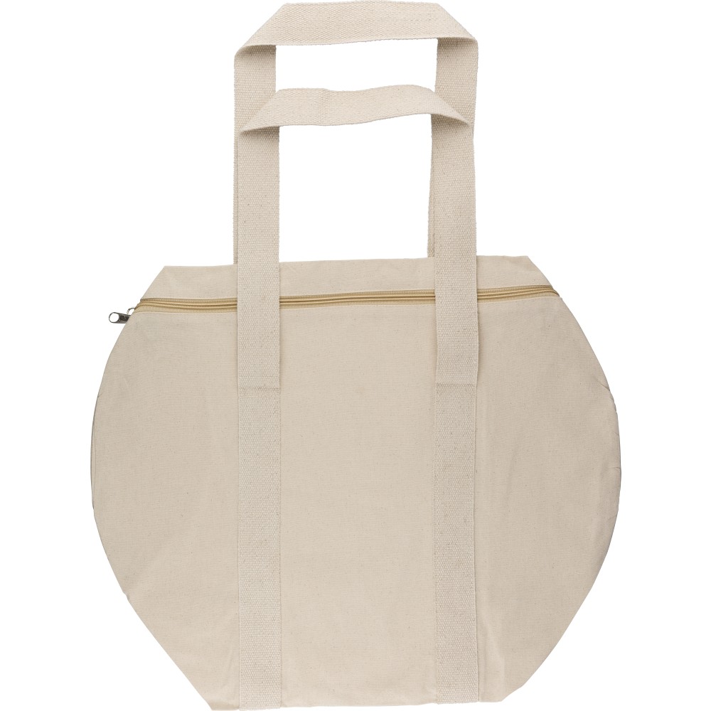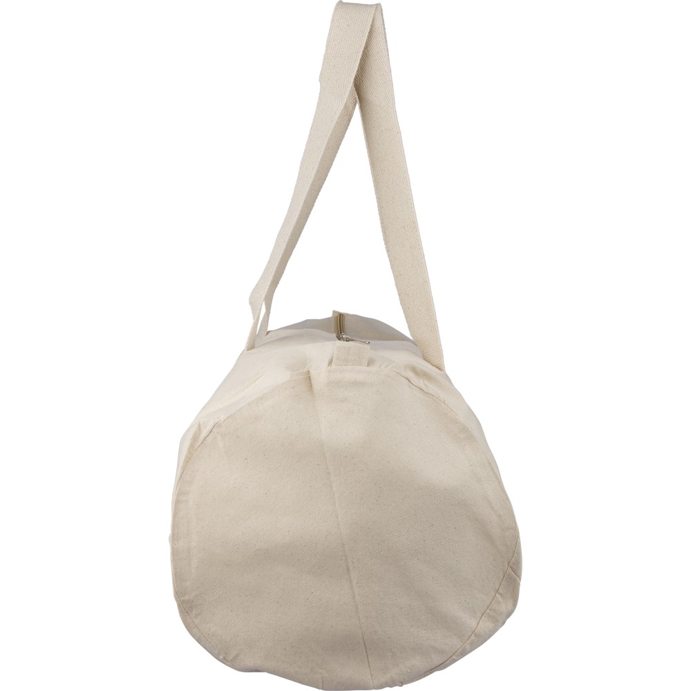 Oeko-Tex minősítésű, 180 g/m2 pamutból készült natúr színű, cipzáras sporttáska 60 cm hosszúságú és 5 cm szélességű pamutfülekkel. Oeko-Tex címkével ellátva.
