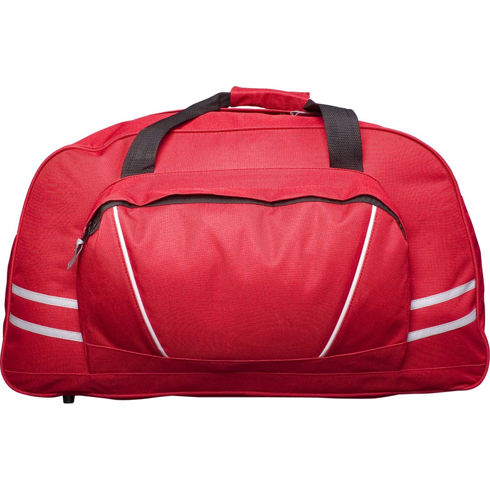 Sport- és utazótáska nagy első zsebbel, fényvisszaverő csíkkal, vállpánttal. 600D poliészter. Emblémázás: Szitanyomás