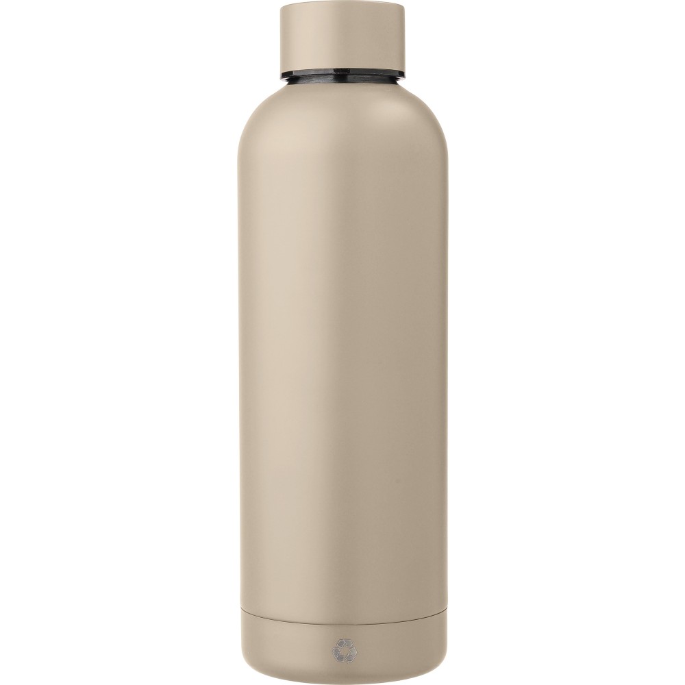Újrahasznosított rozsdamentes acél (s/s304) duplafalú palack, matt felülettel. Barna kartondobozba egyedileg csomagolva. Űrtartalom: 500 ml. Emblémázás: Bögredekor, Gravírozás, Körszita, Tamponnyomás, UV nyomtatás