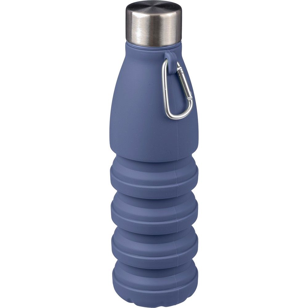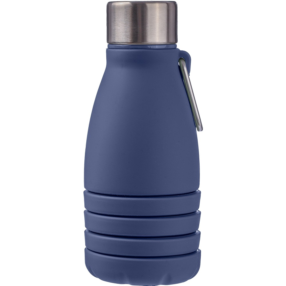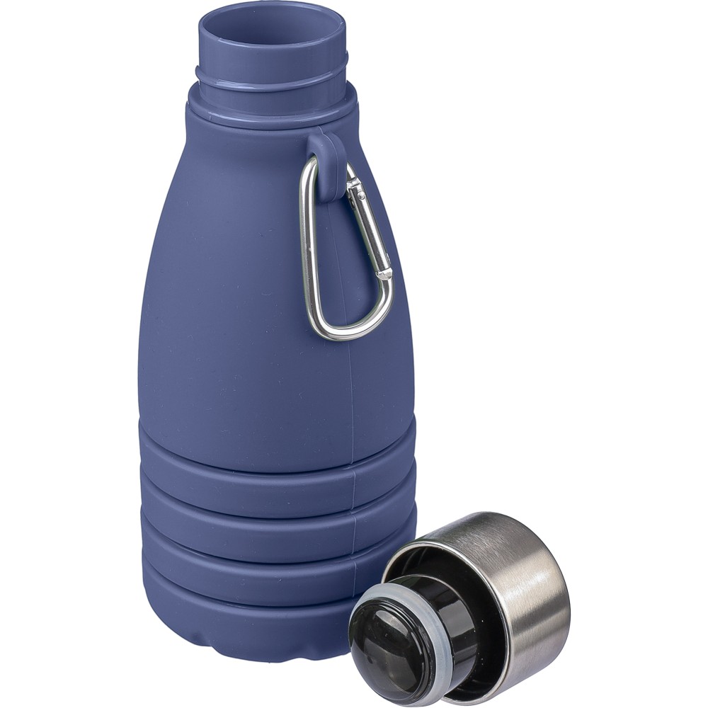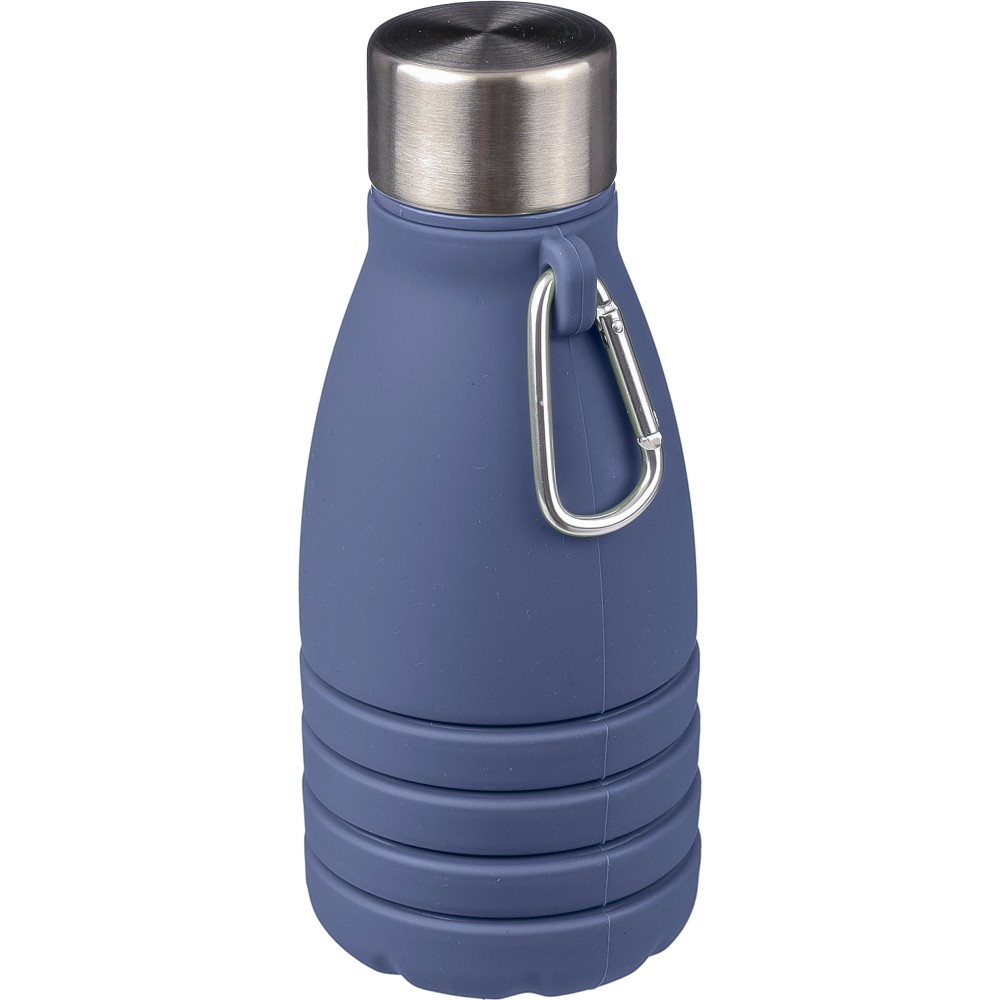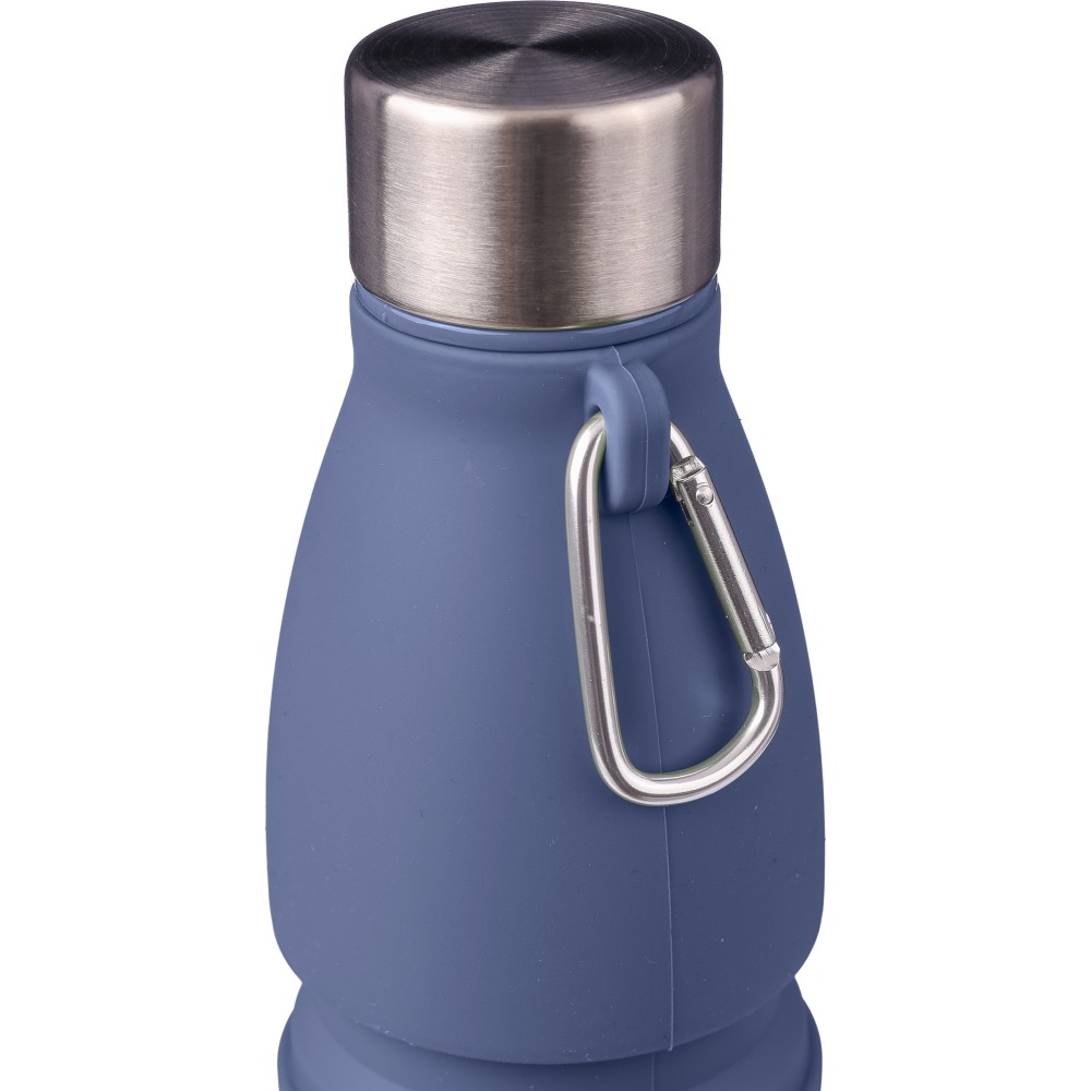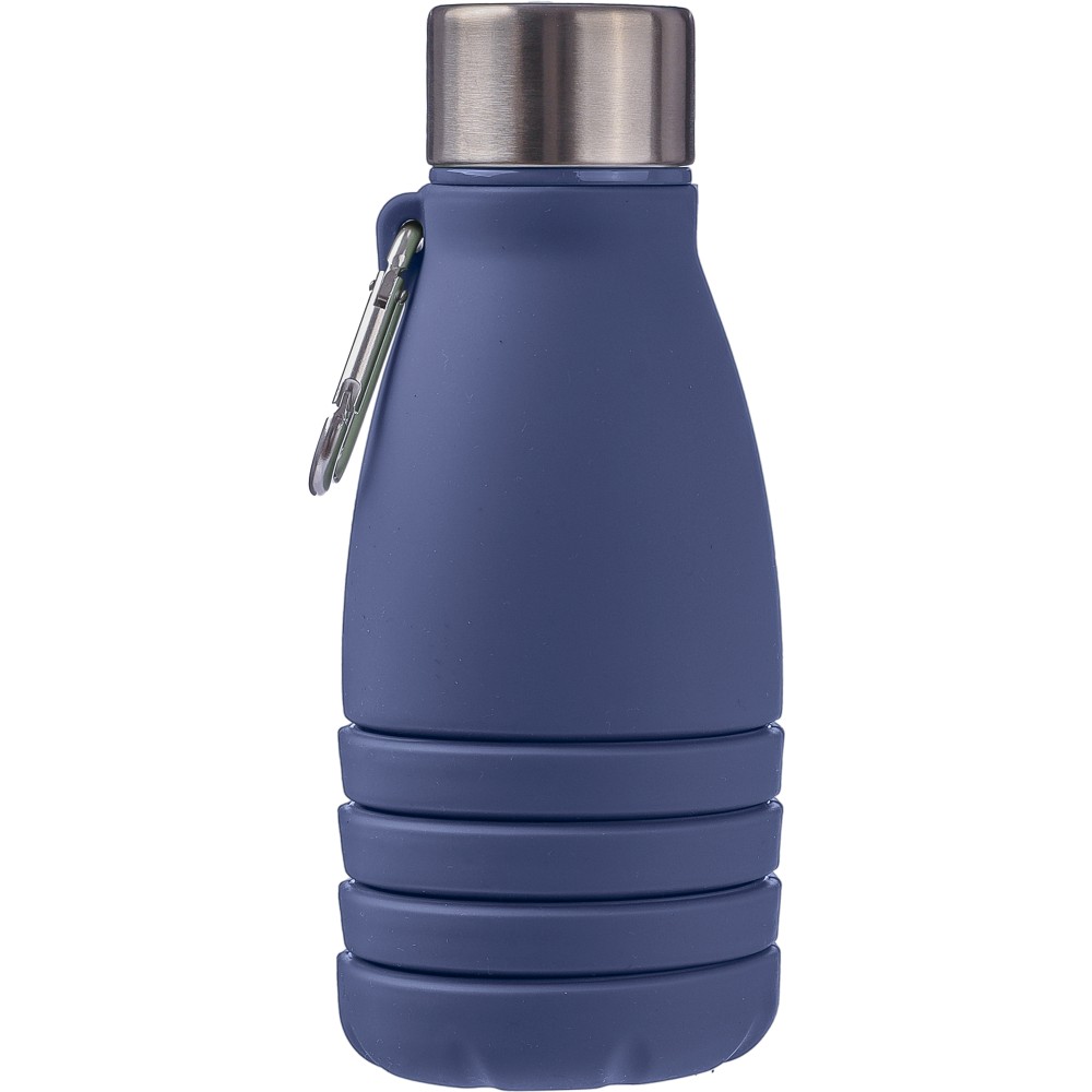 Összecsukható palack rozsdamentes acél fedéllel és alumínium karabinerrel. Összecsukott méret: d: 7x17 cm, kinyitott méret: d: 7x25 cm. Nincs egyenként csomagolva. Anyaga: szilikon. Űrtartalom: 550 ml. Emblémázás: Gravírozás